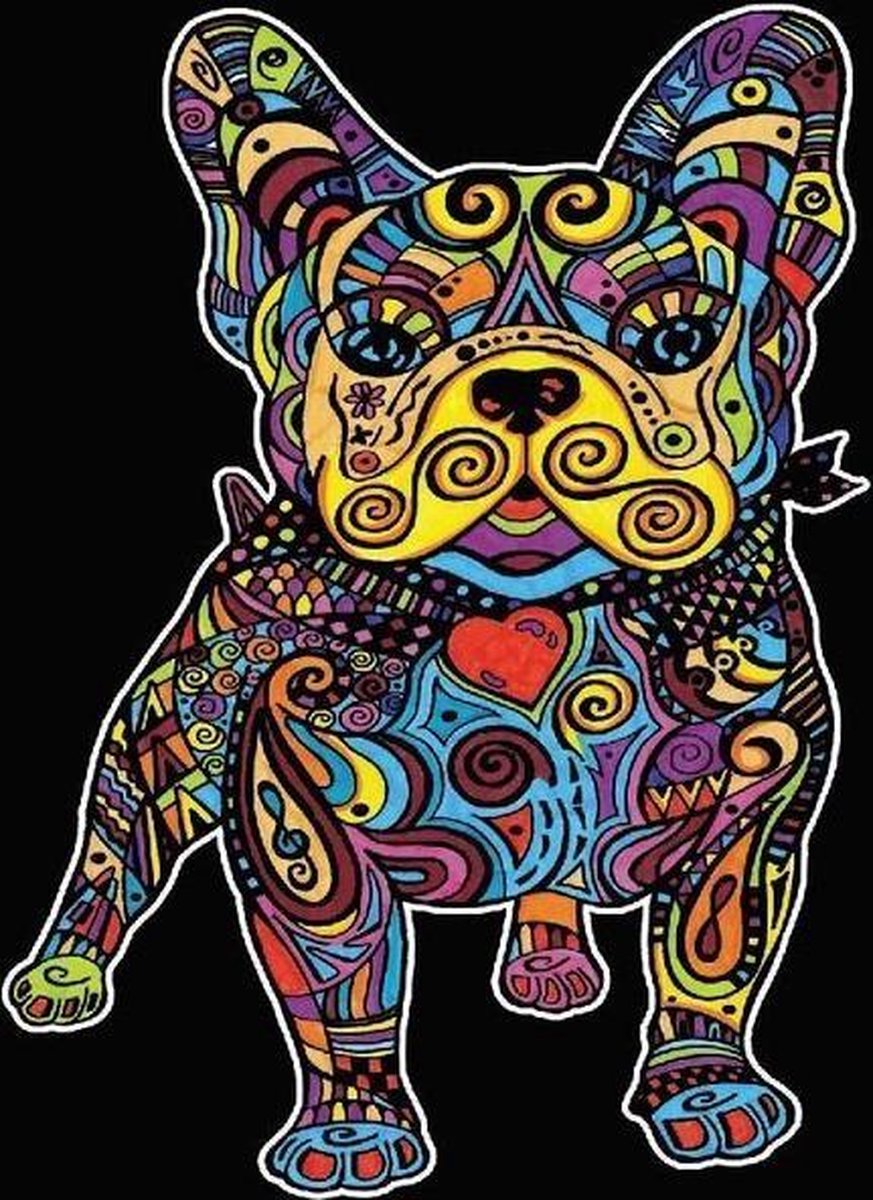 Bull dog Colorvelvet kleurpakket inclusief 12 stiften. Wat is Colorvelvet? Met Colorvelvet maak je de mooiste kunstwerken maar niet zoals de standaard kleurplaten. De tekeningen zijn gemaakt van een speciaal absorberend karton, gedeeltelijk bedekt met een 1mm dikke zwarte laag fluweel waardoor je een duidelijke scheiding krijgt met hetgeen wat je moet inkleuren. Behalve dat dit stuk fluweel ervoor zorgt dat je de witte vlakken makkelijk kunt inkleuren komt het zwarte fluweel naar voren wat een heel chique geheel geeft op je Colorvelvet kleurplaat. Deze tekeningen zijn eenvoudig, dit maakt Colorvelvet leuk en leerzaam waardoor dit ideaal is voor alle leeftijden vanaf 3 jaar en ouder. Met colorvelvet hebben kinderen plezier en leren ze tegelijkertijd, waardoor ze kleurrijke tekeningen maken waarmee ze ook hun slaapkamer kunnen versieren. Maar ook voor volwassenen is Colorvelvet zeer geschikt om lekker creatief bezig te zijn. De tekeningen kan je op allerlei verschillende manieren