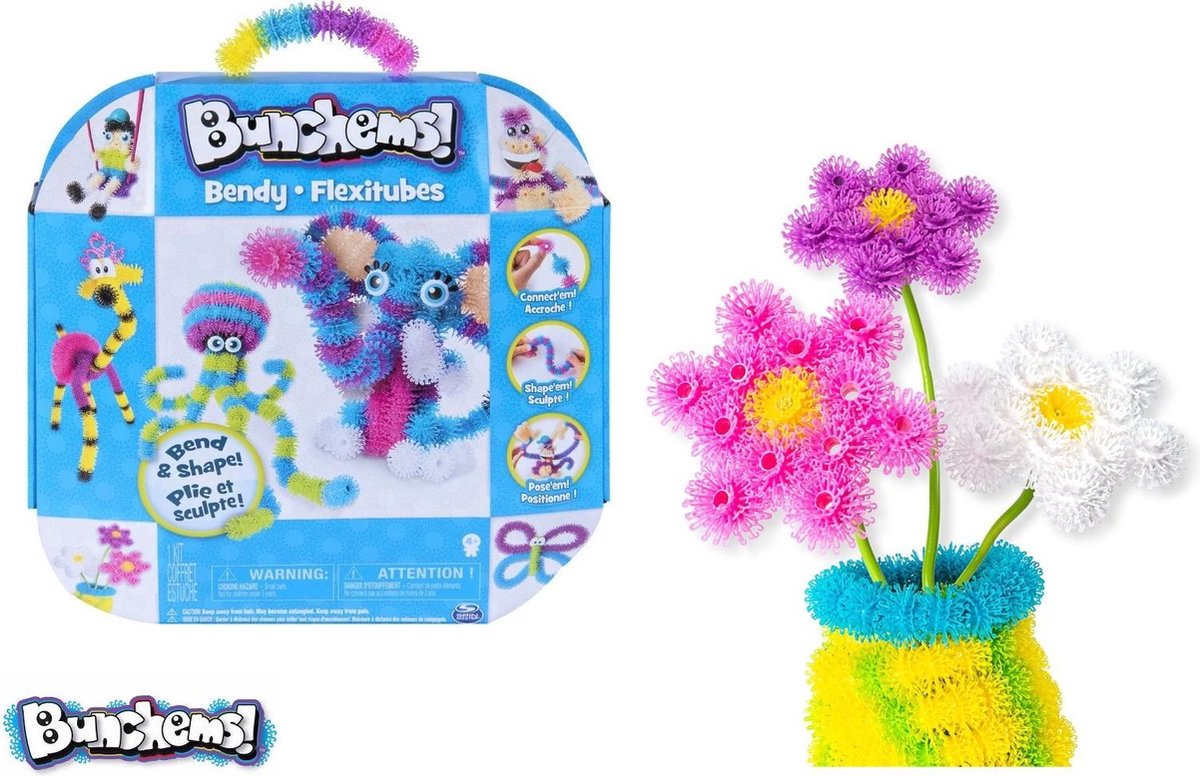 De 345 Bunchems hebben kleine gaatjes in het midden, waardoor je ze op kleine en grote Bendy-sticks kunt schuiven, zes inclusief. Als je eenmaal een Bendy-stick hebt gevuld met Bunchems, kun je de sticks alle kanten op buigen, die je maar kunt bedenken; breng je creaties tot leven met één Big Bunchem en negen leuke accessoires! Gebruik de Bendy-sticks om een schattige olifant, speelse aap, een domme giraffe en meer te bouwen met de meegeleverde Inspiration Guide - of maak je eigen creaties! Laat je fantasie de vrije loop terwijl je creëert met Bunchems, de kleurrijke ballen die op magische wijze samenkomen zonder warmte of lijm. Je kunt ze gemakkelijk uit elkaar trekken voor eindeloos spelen.
