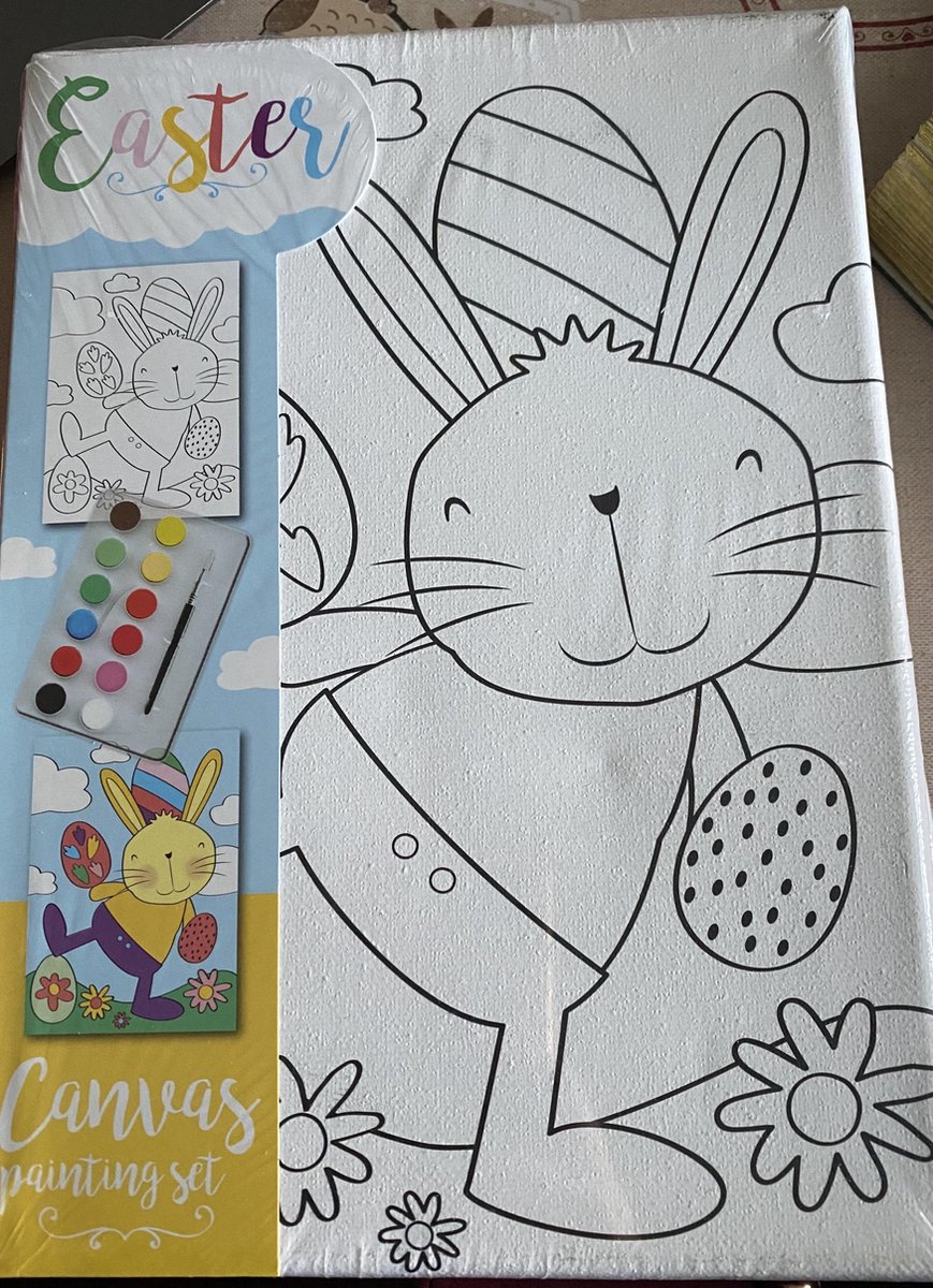 Canvas painting set met als thema Pasen. In dit knutselpakket krijg je 2x een canvas tekening met als thema pasen (2 verschillende) die je helemaal zelf kan beschilderen. Elk canvas doek bevat een tekening en de nodige verf & penseel. Maak je eigen unieke creaties. Bevat volgende kleuren: bruin, geel, donker groen, licht groen, oranje, blauw, bordeaux, rood, roze, zwart & wit. Niet geschikt voor kinderen onder de 3 jaar. Kan kleine onderdelen bevatten.