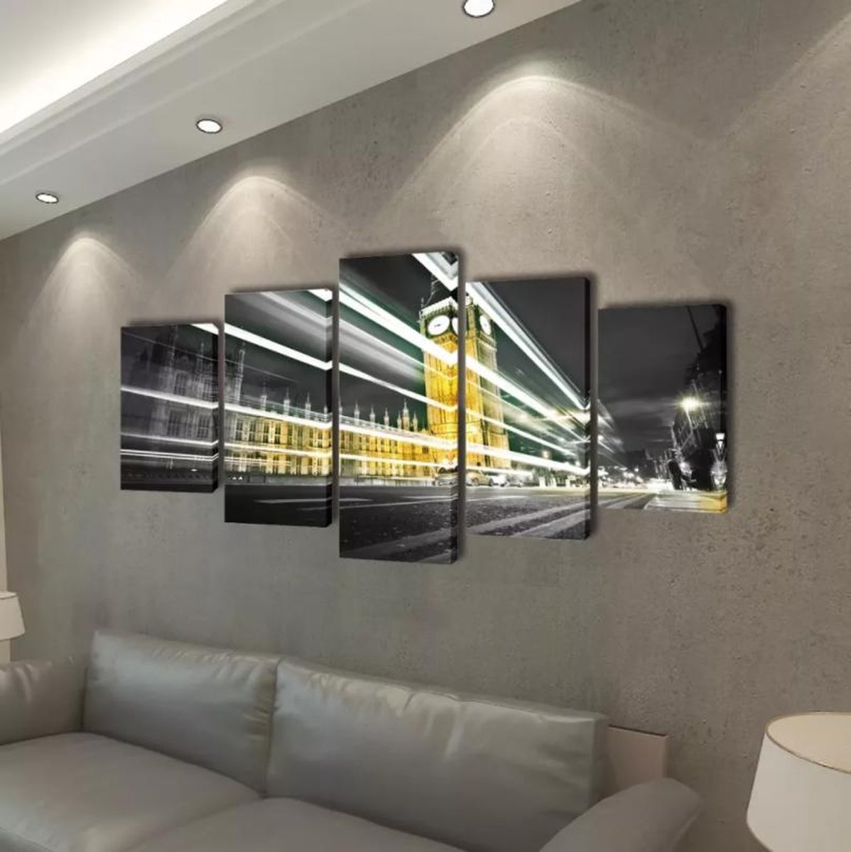 Beschrijving Deze set van 5 canvasdoeken zal een blikvanger zijn in uw woonkamer, eetkamer, slaapkamer, etc. De set is gemaakt van kwalitatief hoogwaardig canvas. De doeken zijn waterbestendig en eenvoudig te reinigen. De print met de beroemde Big Ben geeft de canvasdoeken een moderne uitstraling. Dit canvasdoek is klaar om te worden opgehangen, u heeft geen lijst nodig. Specificaties Canvasdoeken bestaande uit 5 panelen Materiaal: houten frame + waterbestendige canvas Totale afmetingen: 100 x 50 cm (B x H) Afmetingen van iedere canvas: 20 x 50 cm (één), 20 x 40 cm (twee), 20 x 30 cm (twee) Diepte: 1,8 cm Eenvoudig op te hangen Merk: L&B Luxurys