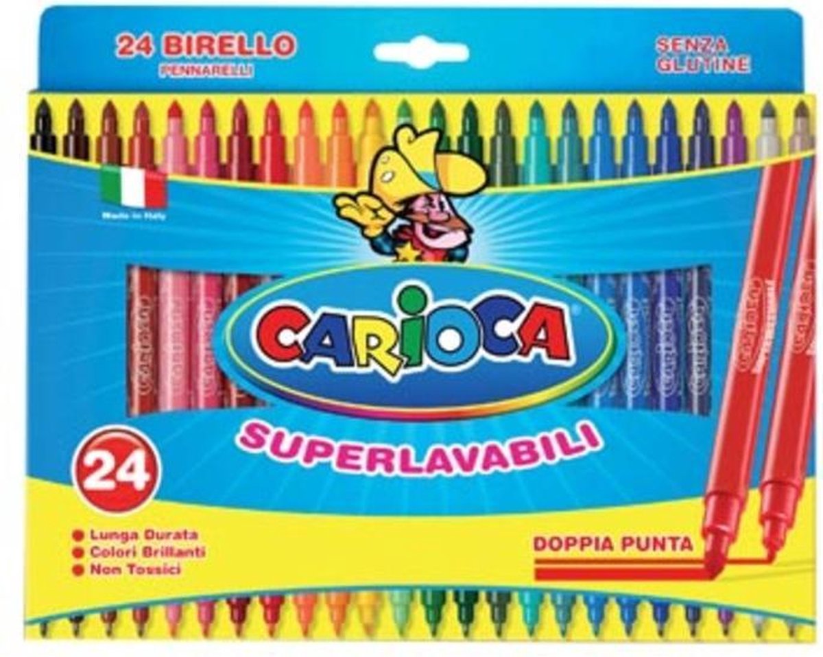 Viltstift met 2 verschillende punten: 2,5 mm om te tekenen en te schrijven, 5 mm om te kleuren. In een kartonnen etui. Uitwasbare inkt.