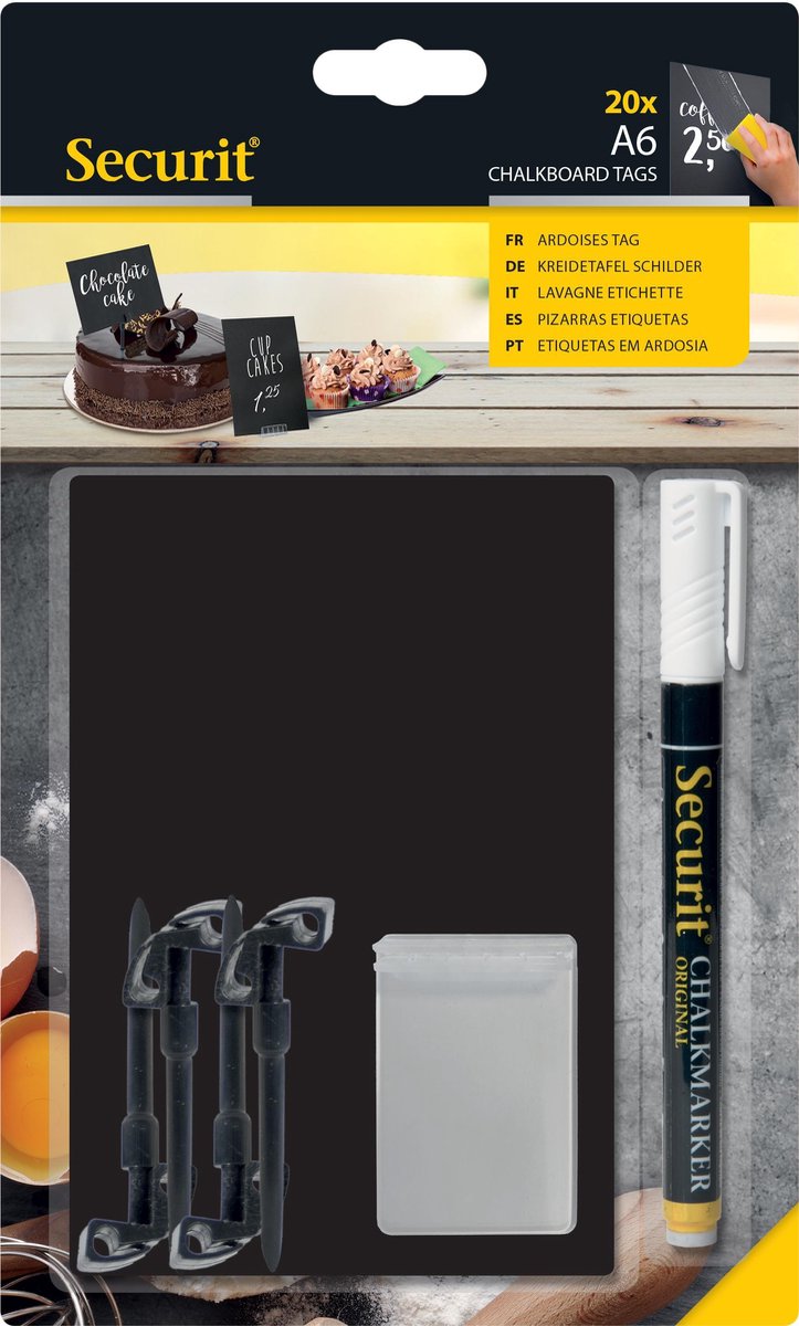 Krijtbord A6. 2-zijdig te gebruiken. Voor het beste schrijfresultaat gebruikt u de Securit krijtstiften. Krijtbord is eenvoudig te reinigen met een vochtige doek. Universele krijtbordjes worden als set per formaat geleverd. Set bestaat uit 20 bordjes, 4 pinhouders, 2 tafelstandaards en één witte krijtstift. 1 blister x 20 stuk