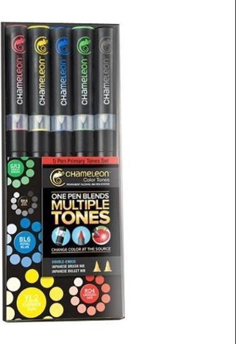 Set met 5 kleur Chameleons: Black, Grass Green, Roqyal Blue, Summer Sun, Crimson Red en 2 reserve penseelpuntjes. De inkt is bij te vullen, de alcohol ook en de punten zijn vervangbaar. Eigenschappen van de Chemeleon color tone marker: Dubbelzijdige stift. Japanse super zachte penseel punt en kogel punt. Professionele kwaliteit inkt op alcohol basis. Navulbaar met inkt. De punten kunnen vervangen worden. Permanent op de meeste oppervlakken. Te gebruiken in combinatie met alle andere alcohol inkten. Niet giftig en geen sterke geur. Ideaal voor alle papierhobbies, Manga tekenen, grafische toepassingen en fijne kunst.