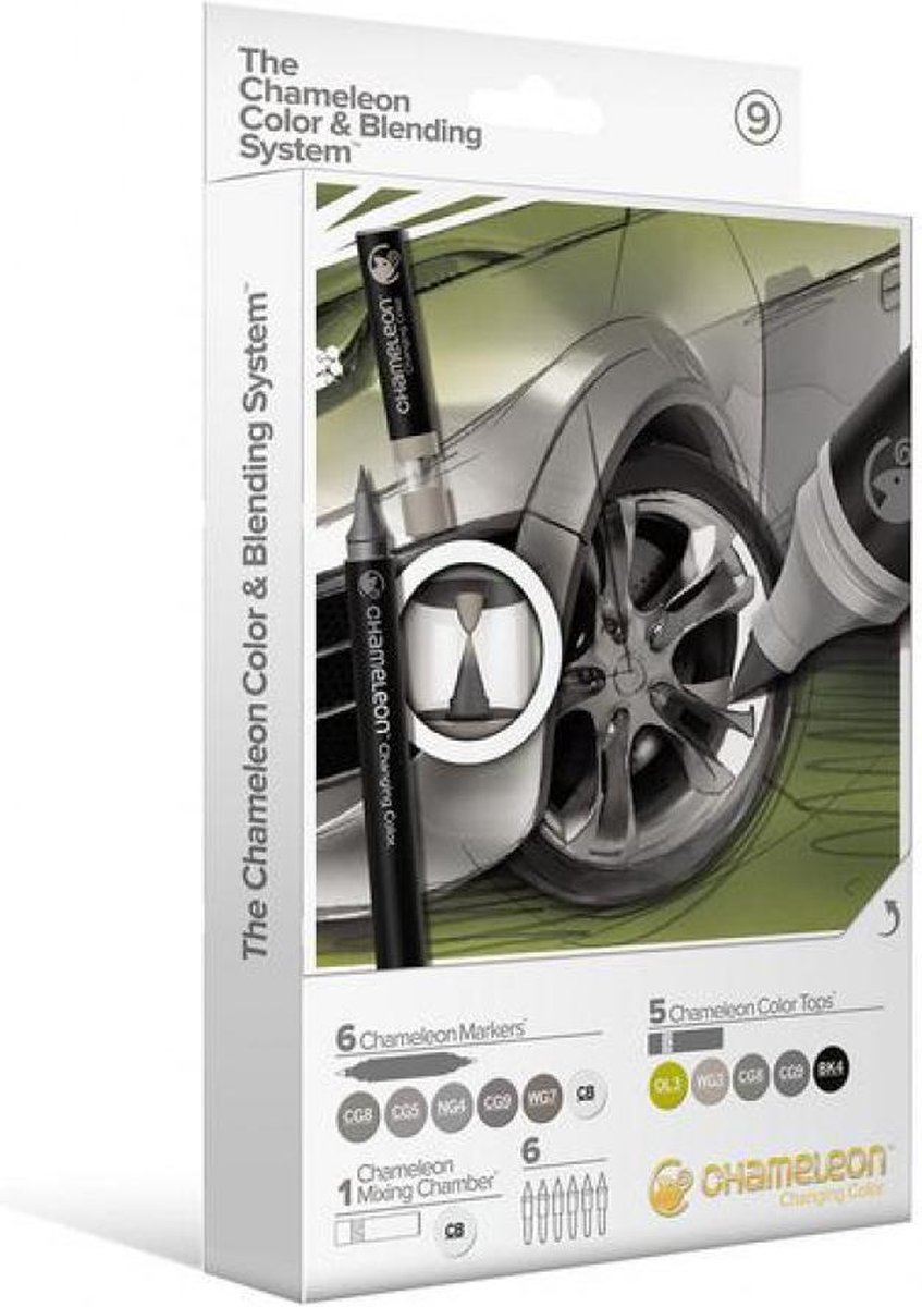Met de nieuwe systemen combineert Chameleon de meermaals bekroonde "Chameleon Markers" met de virale sensatie "Chameleon Color Tops". Het nieuwe Chameleon Color & Blending System ™ geeft artiesten kleurmengopties zoals nooit tevoren ervaren. Met elk pakket kan men meer dan 50 tonen en mengelingen maken. Het is professionele kwaliteit met inkt op alcoholbasis. Je kan ze hervullen en hebben vervangbare Japanse penpunten. De markers zijn permanent op de meeste oppervlakken, inclusief op stof, glas, plastic en hout. Ideaal voor alle creatievelingen van kinderen tot ervaren kunstenaars! Deze set bevat volgend: 6 Chameleon Markers (CG8 Cool Gray 8, CG5 Cool Gray 5, NG4 Neutral Gray, CG9 Cool Gray 9, WG7 Warm Gray 7 en CB Colorless Blender) 5 Chameleon Color Tops (OL3 Olive Green, WG3 Warm Gray 3, CG8 Cool Gray 8, CG9 Cool Gray 9 en BK4 Deep Black) 1 Chameleon Mixing Chamber 6 Chameleon Japanese Brush nibs