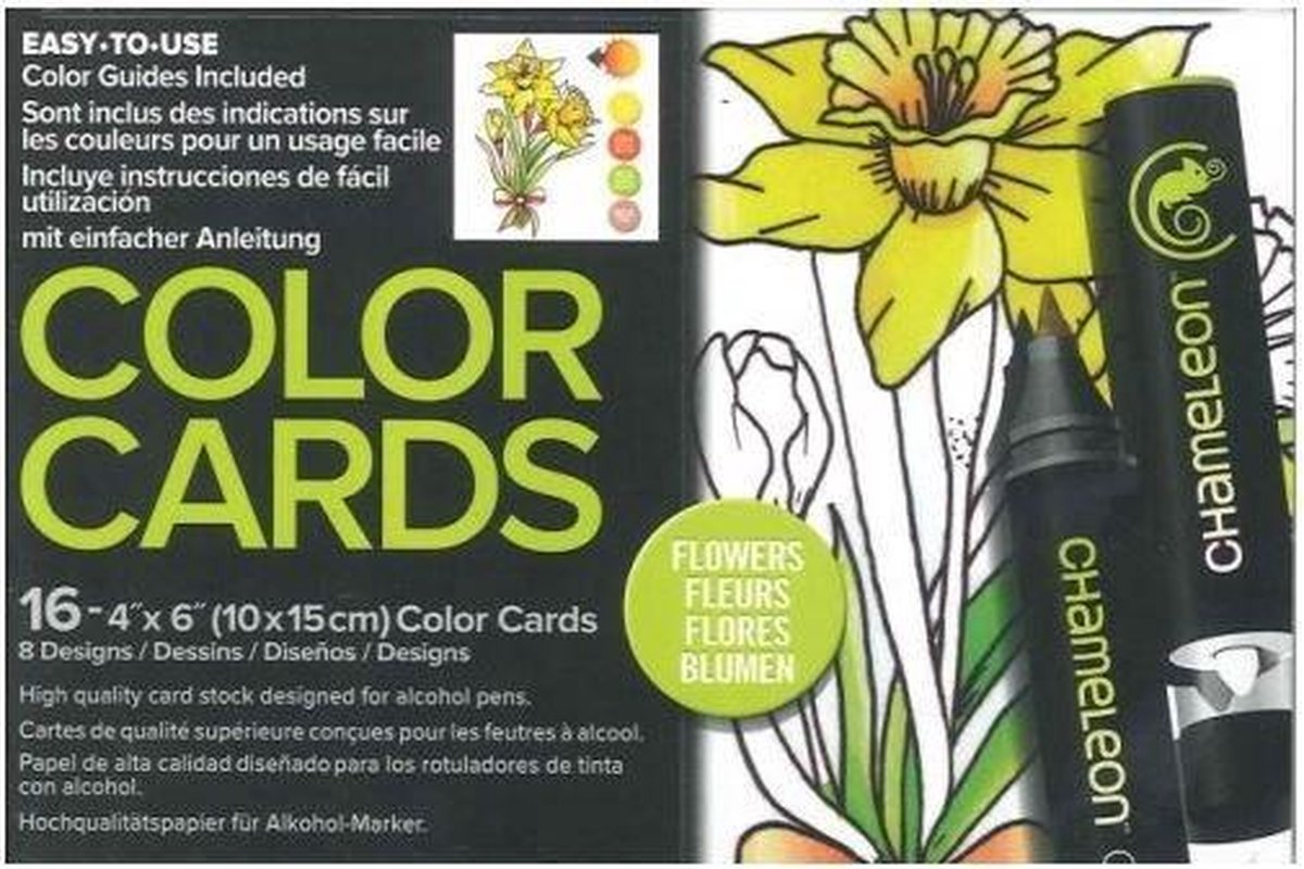De Chameleon color cards, zijn sets met 16 kaarten met bloemen motieven van dik karton (8 verschillende motieven x 2) om in te kleuren met Chameleon stiften.