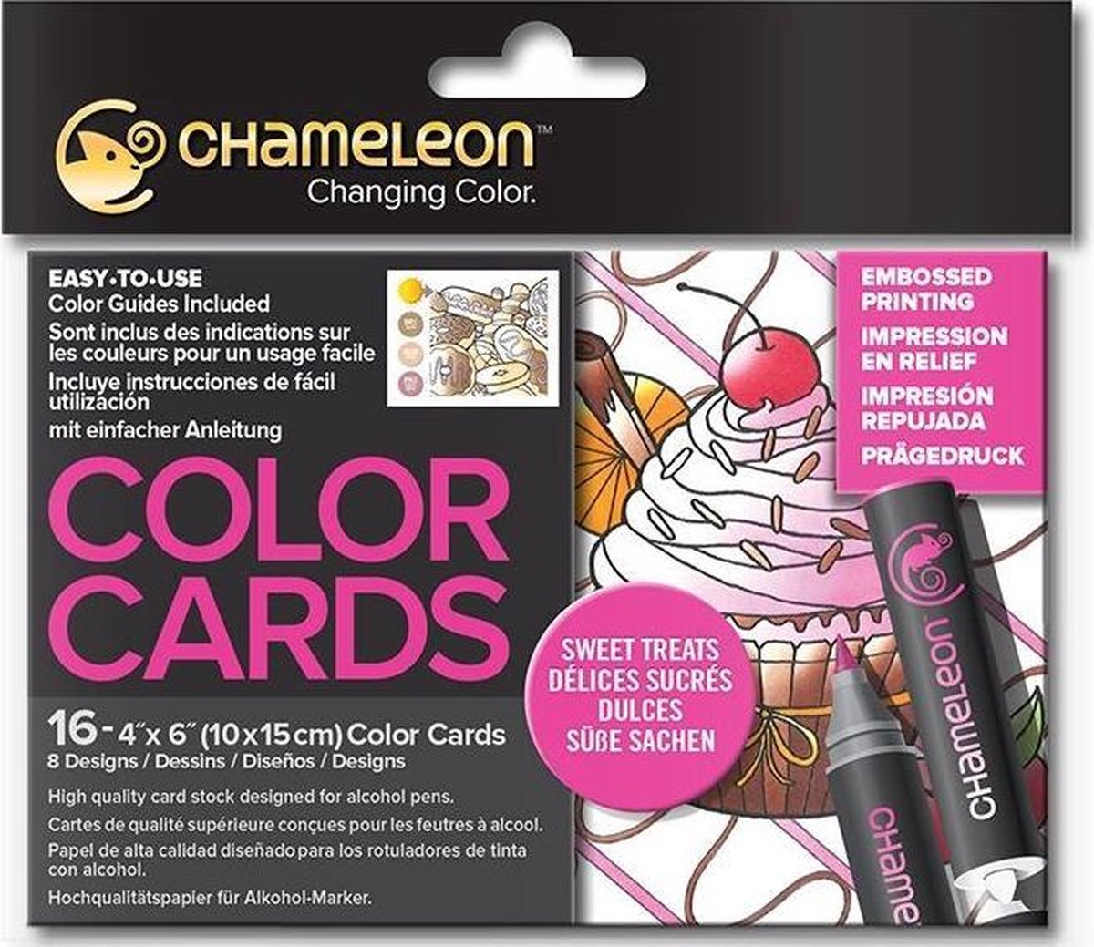 Chameleon Color Cards zijn sets van 16 kaarten in dik karton met afbeeldingen van zoetigheden (8 afbeeldingen x 2) om in te kleuren met Chameleon stiften