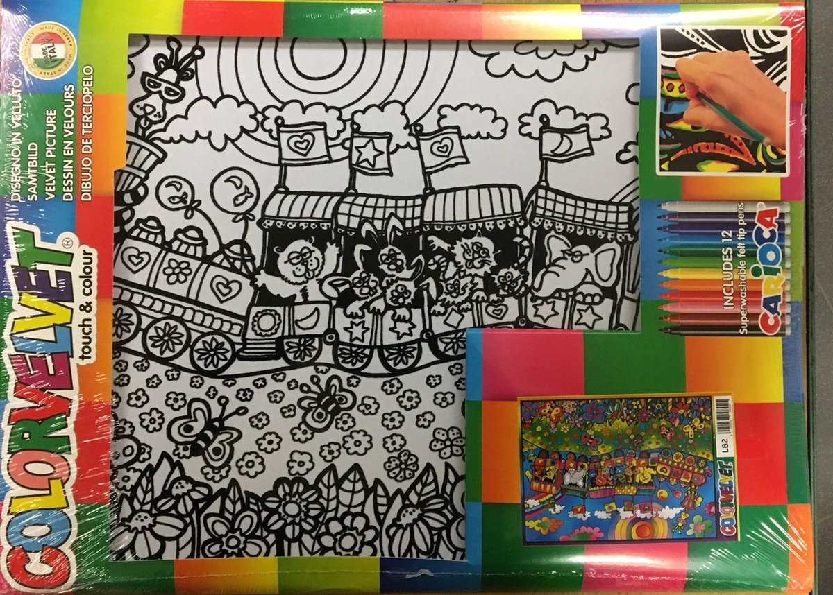 Colorvelvet kleurpakket inclusief 12 stiften. Wat is Colorvelvet? Met Colorvelvet maak je de mooiste kunstwerken maar niet zoals de standaard kleurplaten. De tekeningen zijn gemaakt van een speciaal absorberend karton, gedeeltelijk bedekt met een 1mm dikke zwarte laag fluweel waardoor je een duidelijke scheiding krijgt met hetgeen wat je moet inkleuren. Behalve dat dit stuk fluweel ervoor zorgt dat je de witte vlakken makkelijk kunt inkleuren komt het zwarte fluweel naar voren wat een heel chique geheel geeft op je Colorvelvet kleurplaat. Deze tekeningen zijn eenvoudig, dit maakt Colorvelvet leuk en leerzaam waardoor dit ideaal is voor alle leeftijden vanaf 3 jaar en ouder. Met colorvelvet hebben kinderen plezier en leren ze tegelijkertijd, waardoor ze kleurrijke tekeningen maken waarmee ze ook hun slaapkamer kunnen versieren. Maar ook voor volwassenen is Colorvelvet zeer geschikt om lekker creatief bezig te zijn. De tekeningen kan je op allerlei verschillende manieren inkleuren, het