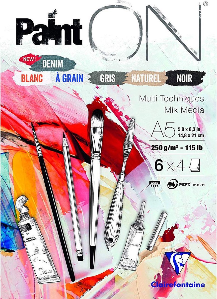 Clairefontaine Paint On is papier voor mixed media technieken. Deze assorti blok bevat 6 soorten papier: wit, denim, gekorreld, grijs, naturel en zwart. Ideaal voor gemengde technieken. Het papier heeft een enigszins ruw oppervlak. Dankzij het zware gewicht van 250 g/m2 is Paint On geschikt voor zowel droge als natte technieken. Bestand tegen krassen en gummen zonder te pluizen. Zuurvrij. Geschikt voor onder andere acrylverf, aquarelverf, inkt, potlood, houtskool, viltstift, lijmen, oliepastel en meer. Details: - 24 vel (6 x 4 vel), 250 grams, A5 formaat (4 vellen in wit, korrel, grijs, naturel, zwart en denim). - Denimkleur is een papier met een natuurlijke minerale tint van een grijsblauw dat perfect geschikt is voor tekenen, bloed, pastel, Chinese inkt, waterverf en olieverf.