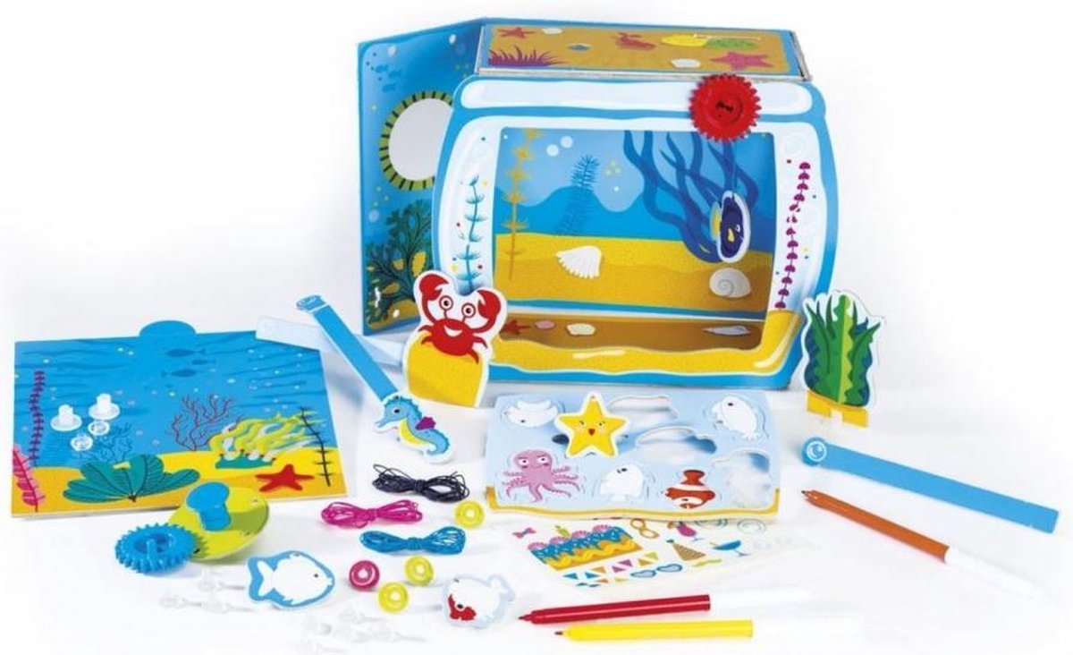 Het perfecte speelgoed voor een duik in een wonderlijke creatieve wereld! Zet dit grappige aquarium in elkaar, versier het en vul het met schattige visjes die je zelf van verschillende materialen kunt maken. Deze set bevat ook een achtergrond om zelf in te kleuren en heel wat onderdelen waarmee je de vissen kunt laten bewegen en ‘zwemmen’, voor eindeloos speelplezier! Stimuleert de fijne motoriek en de creativiteit van de jongste kinderen.
