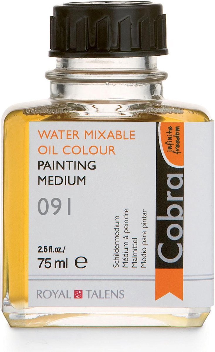 COBRA SCHILDERSMEDIUM 091. 75ML. Cobra schildermedium maakt de verf makkelijker verwerkbaar en vetter. Hierdoor smeert de verf beter uit en vervaagt de penseelstreek . Het gebruik heeft geen invloed op de droogtijd van de verf maar het verhoogt wél de glansgraad en de duurzaamheid. Dit medium kan ook met water worden gemengd en is geschikt bij gelaagd schilderen. Cobra schildermedium is gebaseerd op plantaardige olie, synthetische hars en water.