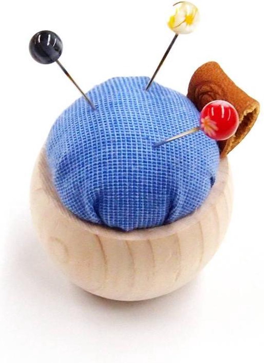 Dit speldenkussen is gemaakt van Hinoki Cypresshout en gevuld met een anti-roestvulling en stof van Banshu. Door middel van het leren lusje kan je het speldenkussen als een kettinghanger gebruiken. Het meet ongeveer 3,3 cm in diameter en 3,5 cm in hoogte.
