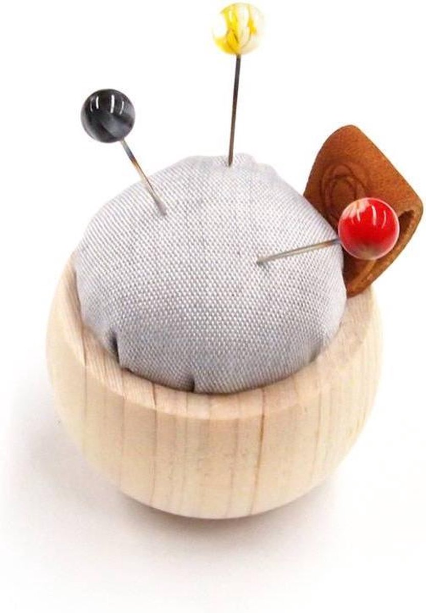 Dit speldenkussen is gemaakt van Hinoki Cypresshout en gevuld met een anti-roestvulling en stof van Banshu. Door middel van het leren lusje kan je het speldenkussen als een kettinghanger gebruiken. Het meet ongeveer 3,3 cm in diameter en 3,5 cm in hoogte.