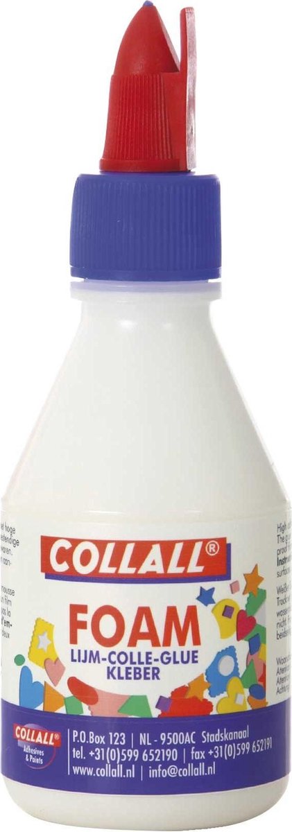 Collall Original foamlijm Met deze foamlijm kan je mooiste foamen knutselprojecten maken. De lijm is dikvloeibaar, sneldrogend en flexibel. Na droging is de lijm transparant en waterafstotend. Specificaties: Geslacht: unisex Kleur: wit, transparant Materiaal: kunststof Inhoud: 100 ml Leeftijd: vanaf 6 jaar