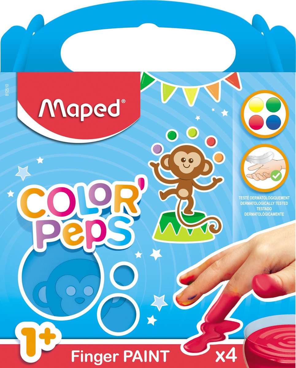 Maped Early Age vingerverf. De 1e kennismaking met verf. Dermatologisch getest en geschikt voor jonge kinderen (zelfs beneden 3 jaar). Direct te gebruiken verf, zonder toevoeging van water. Zalfachtige samenstelling die geen druppels vormt. Goede dekking. 4 zeer heldere en levendige kleuren. Zeer goed afwasbaar met alleen water. De deksels hebben een leuk motief en zijn voorzien van schroefdraad. Niet eenvoudig door kleine kinderen zelf te openen.