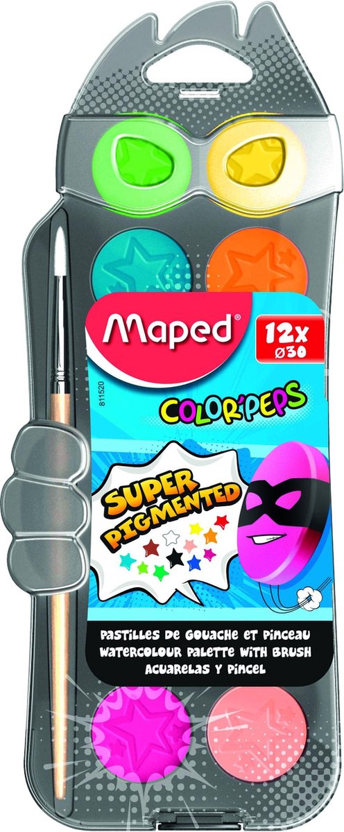 Waterverfdoos met 12 verfnapjes van 30 mm. Door meer of minder water toe te voegen kun je meer transparant of meer dekkend resultaat krijgen. De napjes zitten vast in de doos: eenvoudig onder de kraan te reinigen. Het deksel van de onbreekbare box is verwijderbaar. Wordt inclusief een penseel geleverd.