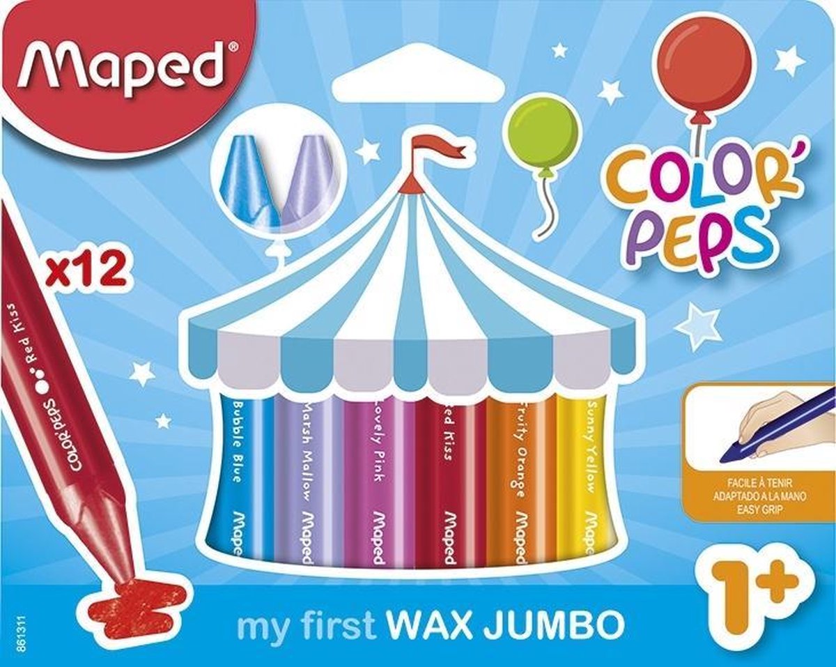 Zachte waskrijtjes met heldere kleuren. Papieromhuld om je handen schoon te houden. Het MAXI formaat zorgt voor een betere grip voor kinderen. 3-kantig voor een ergonomische grip.