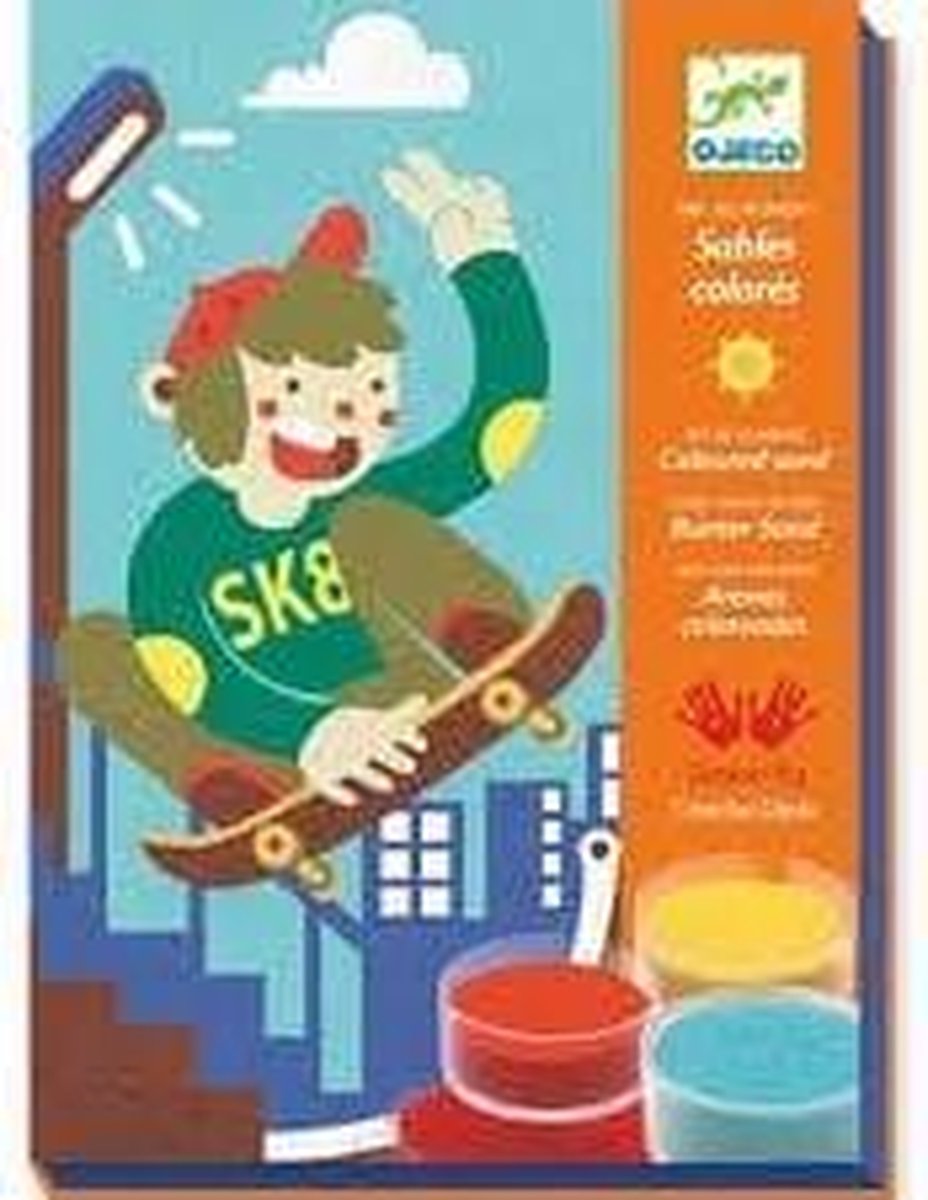 Gekleurd zand. kunst op nummer. Passier voor glijden. Zand in 12 kleuren om eenvoudig 4 spannende schilderijen van onverschrokken sporters te maken. vanaf 6 jaar