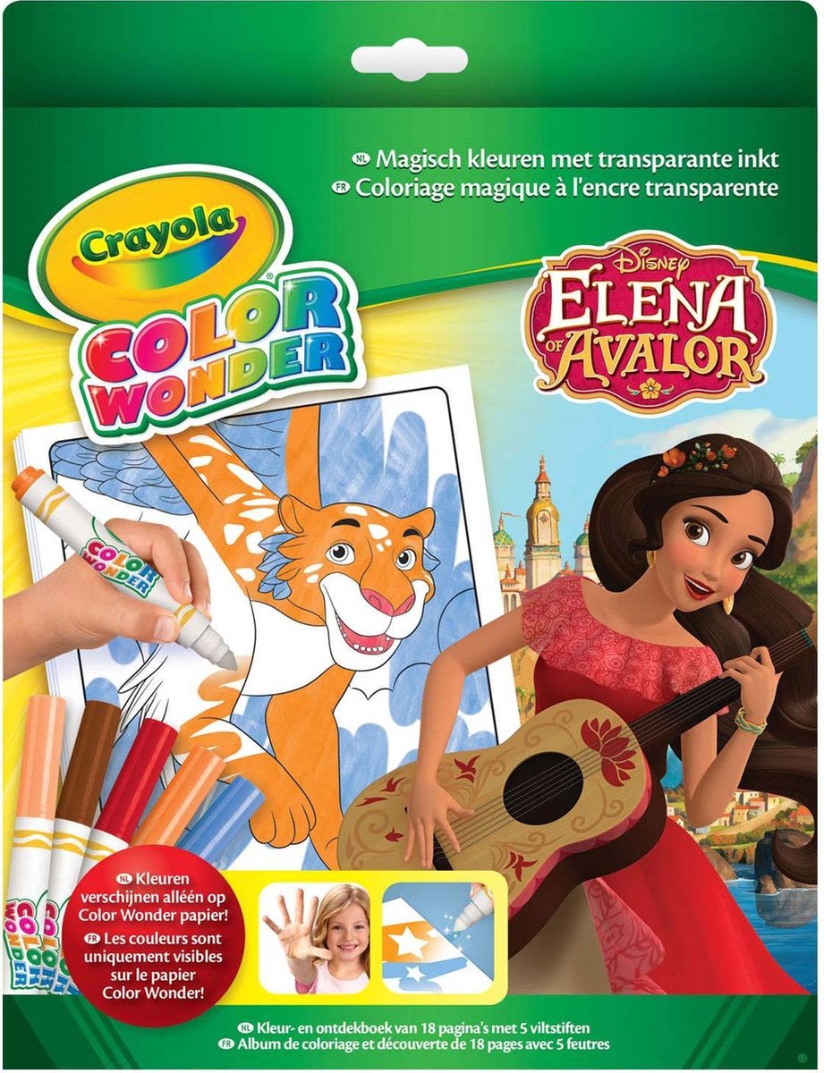 Ervaar met dit unieke Color Wonder kleurboek hoe Prinses Elena haar betoverende sprookjeskoninkrijk Avalor beschermt tegen het kwaad. Dit kleurboek staat vol met vrolijke illustraties van alle karakters uit de tv-serie Elena van Avalor: Prinses Isabel, Zuzo, goede vriend Matteo en ook haar magische vliegende vrienden Migs, Luna en Skylar. Kleur de magische wereld van Prinses Elena in en ontdek de geheime elementen die verborgen zitten in de achtergronden van de kleurplaten. Color Wonder is een speciaal concept voor kinderen die nog weleens buiten de lijntjes kleuren. De inkt van de 5 bijgevoegde Color Wonder stiften verschijnen alleen op Color Wonder papier en niet op andere ondergronden. Color Wonder neemt hierdoor stress weg over vlekken maken op huid, kleding of meubelen. Kleuren was nog nooit zo leuk en verrassend als met Color Wonder, het knoeivrije kleurboek van Crayola! - Color Wonder kleurboek Elena van Avalor(18 pagina's). - 5 Color Wonder viltstiften. - Inkt van Color Wonder
