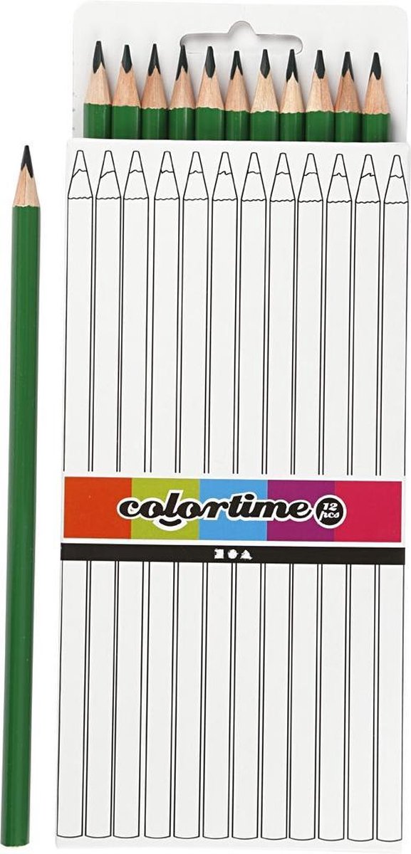 Colortime kleurpotloden Driehoekige kleurpotloden met natuurlijke greep, wat zorgt voor een ontspannen houding tijdens het kleuren. Geschikt voor links- en rechtshandigen. Deze set kleurpotloden zijn verpakt in een kartonnen doos. Specificaties: Geslacht: junior Materiaal potlood: hout, grafiet Materiaal doos: karton Lengte: 17 cm Vulling: 3 mm Kleur: donkergroen Leeftijd: van 4 tot 12 jaar Inhoud: 12 Kleurpotloden 1 Opbergdoos