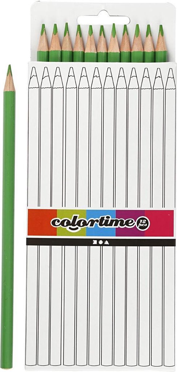 Colortime kleurpotloden Driehoekige kleurpotloden met natuurlijke greep, wat zorgt voor een ontspannen houding tijdens het kleuren. Geschikt voor links- en rechtshandigen. Deze set kleurpotloden zijn verpakt in een kartonnen doos. Specificaties: Geslacht: junior Materiaal potlood: hout, grafiet Materiaal doos: karton Lengte: 17 cm Vulling: 3 mm Kleur: groen Leeftijd: van 4 tot 12 jaar Inhoud: 12 Kleurpotloden 1 Opbergdoos