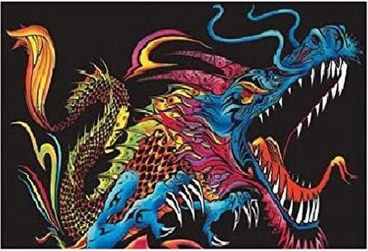 Spuwende draak Colorvelvet map kleurpakket inclusief 12 stiften. Wat is Colorvelvet? Met Colorvelvet maak je de mooiste kunstwerken maar niet zoals de standaard kleurplaten. De tekeningen zijn gemaakt van een speciaal absorberend karton, gedeeltelijk bedekt met een 1mm dikke zwarte laag fluweel waardoor je een duidelijke scheiding krijgt met hetgeen wat je moet inkleuren. Behalve dat dit stuk fluweel ervoor zorgt dat je de witte vlakken makkelijk kunt inkleuren komt het zwarte fluweel naar voren wat een heel chique geheel geeft op je Colorvelvet kleurplaat. Deze tekeningen zijn eenvoudig, dit maakt Colorvelvet leuk en leerzaam waardoor dit ideaal is voor alle leeftijden vanaf 3 jaar en ouder. Met colorvelvet hebben kinderen plezier en leren ze tegelijkertijd, waardoor ze kleurrijke tekeningen maken waarmee ze ook hun slaapkamer kunnen versieren. Maar ook voor volwassenen is Colorvelvet zeer geschikt om lekker creatief bezig te zijn. De tekeningen kan je op allerlei verschillende