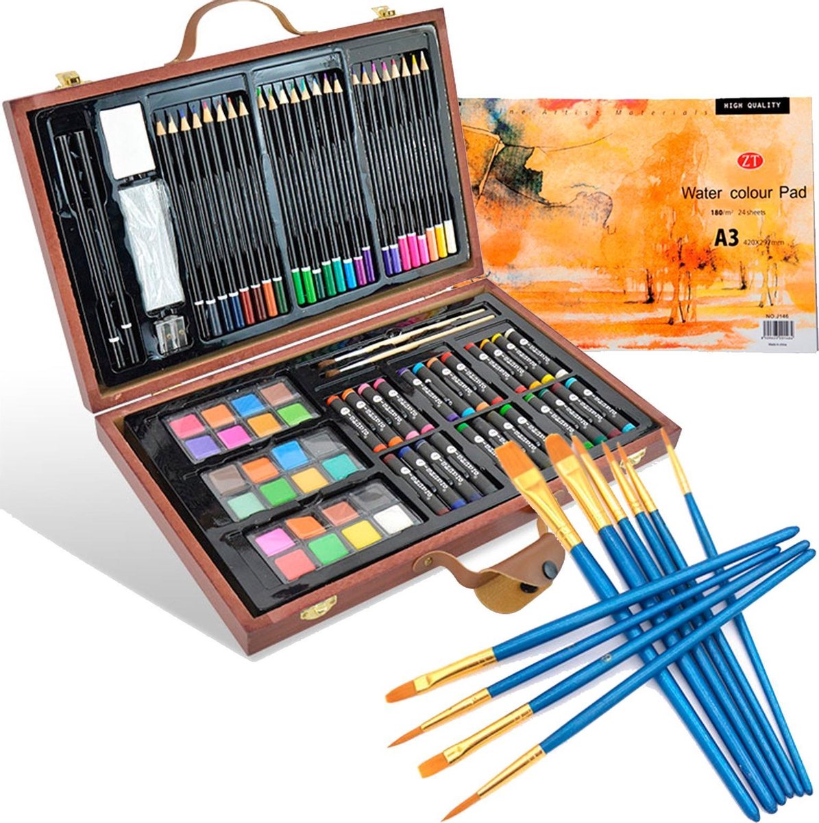 Met deze wonderschone teken/schilderset wordt jouw creatieve brein weer tot werking gesteld! Deze perfecte tekenset kan je overal mee naartoe nemen als koffer om overal waar je wilt te kunnen tekenen. Door de vele extra onderdelen die worden meegeleverd raak je nooit meer verveeld en valt er altijd weer iets nieuws te beleven! Alles in 1! Door de hoge kwaliteit en vele onderdelen die deze tekenset bevat, is er van alles te doen met deze tekenset. Zo wordt er een groot aquarelpapier sheet meegeleverd. Met dit speciale papier krijg je een veel beter waterverf effect. De extra penselen zijn van hoge kwaliteit en zorgen voor een veel gemakkelijkere ervaring. Kort gezegd, deze schilder/tekenset bevat alle spullen om jouw creatieve ideeën uit te werken. De perfecte Tekenset Zeer uitgebreid Houten koffer Handig om mee te nemen Vele uren plezier en creativiteit Specificaties 24 oliepastels, 24 kleurpotloden, 24 kleuren waterverf, 2 kwasten, 1 HB potlood, 1 2B potlood, 1 blad papier om