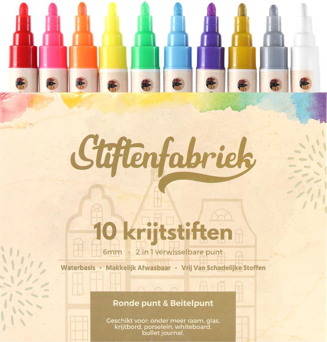 Ben jij gek op het maken van raamtekeningen? Om op je raam te kunnen tekenen, heb je krijtstiften nodig. In onze complete set krijtstiften zitten alle kleuren van de regenboog én natuurlijk de bekende witte krijtstift. Als bonus hebben we ook nog goud én zilver toegevoegd. Kortom, met één complete set krijtstiften heb je alles in huis om de mooiste raamtekeningen te maken. Maar pas op het werkt verslavend! Waarop kan ik nu tekenen met mijn krijtstiften.......? Naast ramen is het ook super leuk om te tekenen op theelichtjes, spiegels, glazen vazen, bloempotjes en nog veel meer. Heb jij al eens een krijtstift tekening in huis gemaakt? Krijtstiften voor elke ondergrond De krijtstiften van de Stiftenfabriek zijn perfect om te gebruiken op ramen. Vandaar dat we ze ook Raamstiften noemen. Ze zijn te veelzijdig om maar één naam te krijgen! Als je wilt gaan kleuren op je raam, glas, krijtborden, whiteboard, porseleinen kopjes of keramieken bloempotjes, alles kan met deze stiften. Maar