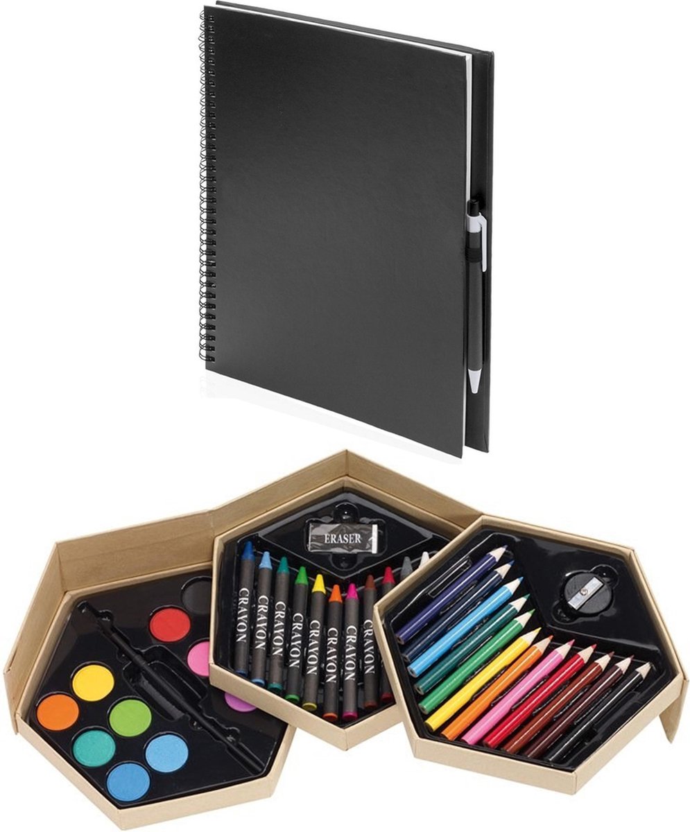 Complete teken/schilder doos 39-delig met een A4 schetsboek met harde kaft. Luxe teken- en schilder set in een kartonnen doos met drie lagen. Deze complete kleurset bestaat uit 12 kleurpotloden, 12 wascokrijtjes, 12 kleuren waterverf inclusief penseel, 1 puntenslijper en 1 gum. De blanco kartonnen doos is eventueel naar eigen smaak te versieren. Formaat: ongeveer 18 x 9 x 7 cm. Kleurdozen/tekenset/schilderset hobby materiaal. Het A4 schetsblok met harde kaft bevat 80 vellen wit 80 grams papier. bestaande uit 1x Complete teken/schilderset doos 39-delig, 1x Schetsboek/tekenboek zwart A4 formaat 80 vellen inclusief pen