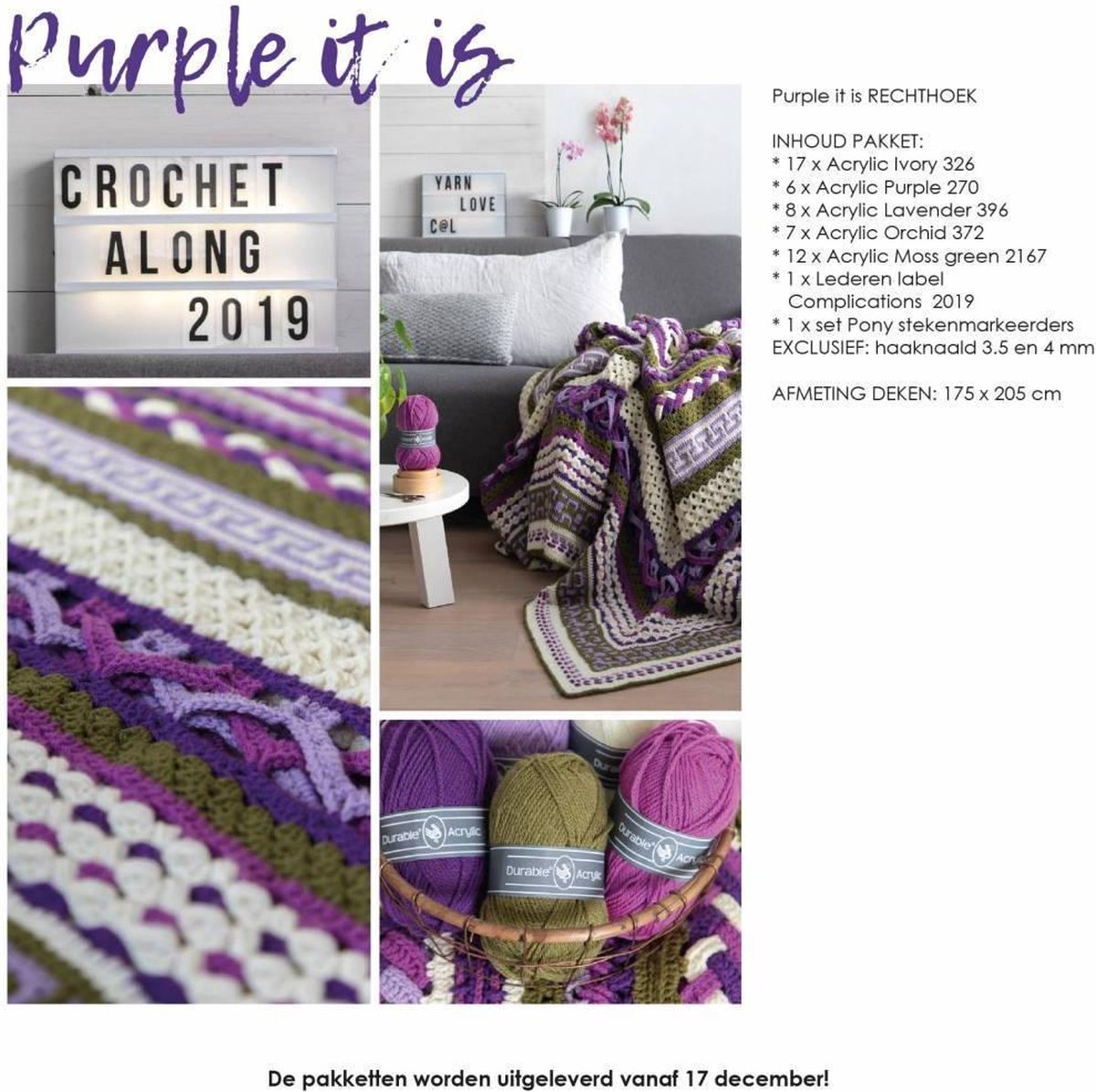 Met de Nostalgia CAL van dit jaar in het achterhoofd hebben Jolanda en Naomi de afgelopen periode hard gewerkt aan een geheel nieuwe CAL voor 2019: Complications! De naam verklapt het al een beetje, want de Complications CAL zal op verzoek wat meer uitdagingen op haakgebied bevatten. Elk deel van de CAL is een nieuw patroon. Er is gekozen voor soms wat ongewone, niet altijd makkelijke, steken en patronen. Een uitdaging, maar een beetje uitdaging gaat niemand uit de weg toch? Complications 2019 is in twee varianten ontworpen: een rechthoekige plaid en een vierkante. De kleurencombinaties 'Stormy Weather' en 'Purple it is!' zijn in beide formaten gehaakt met een nieuw Durable Acrylic garen wat specifiek voor deze CAL in pakketvorm verkrijgbaar is. Wanneer? De Crochet Along 2019 start 18 januari en eindigt in mei, met een prachtige plaid als eindresultaat. De patronen zullen voorzien zijn van duidelijk geschreven teksten, haakdiagrammen en filmpjes. Via de Facebookgroep 'Haakplein' en