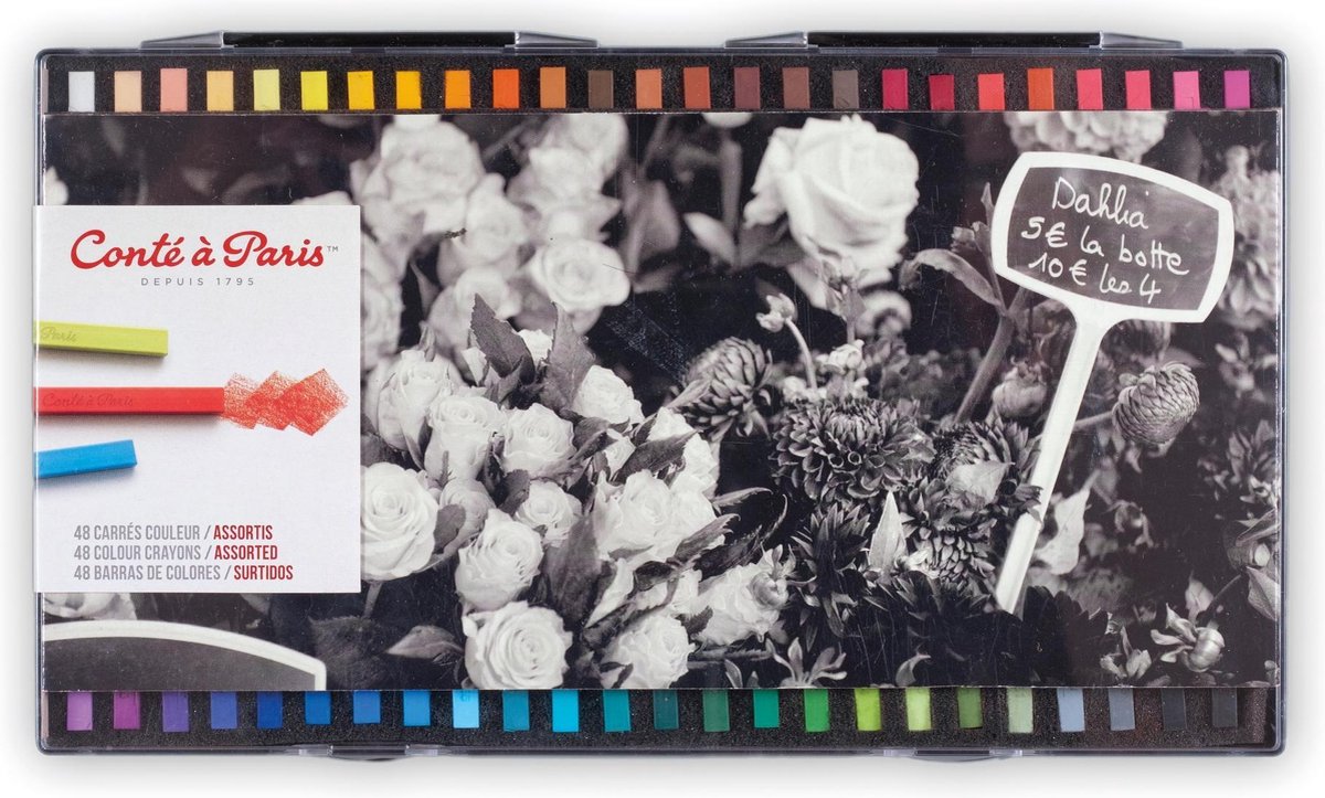 "Conté à Paris Carré kleurkrijt is ideaal voor het maken van kleurrijke kunstwerken en krijttekeningen. Door de vierkante vorm kun je het veelzijdige krijt op verschillende manieren gebruiken. De randen zijn geschikt voor het tekenen van nauwkeurige lijnen en met de vlakke kant kun je makkelijk grote oppervlaktes inkleuren. Deze set bevat 48 verschillende kleuren Carré kleurkrijt. Wanneer je de mooiste tekeningen wilt maken, kun je met deze uitgebreide selectie ontzettend veel kanten op. "