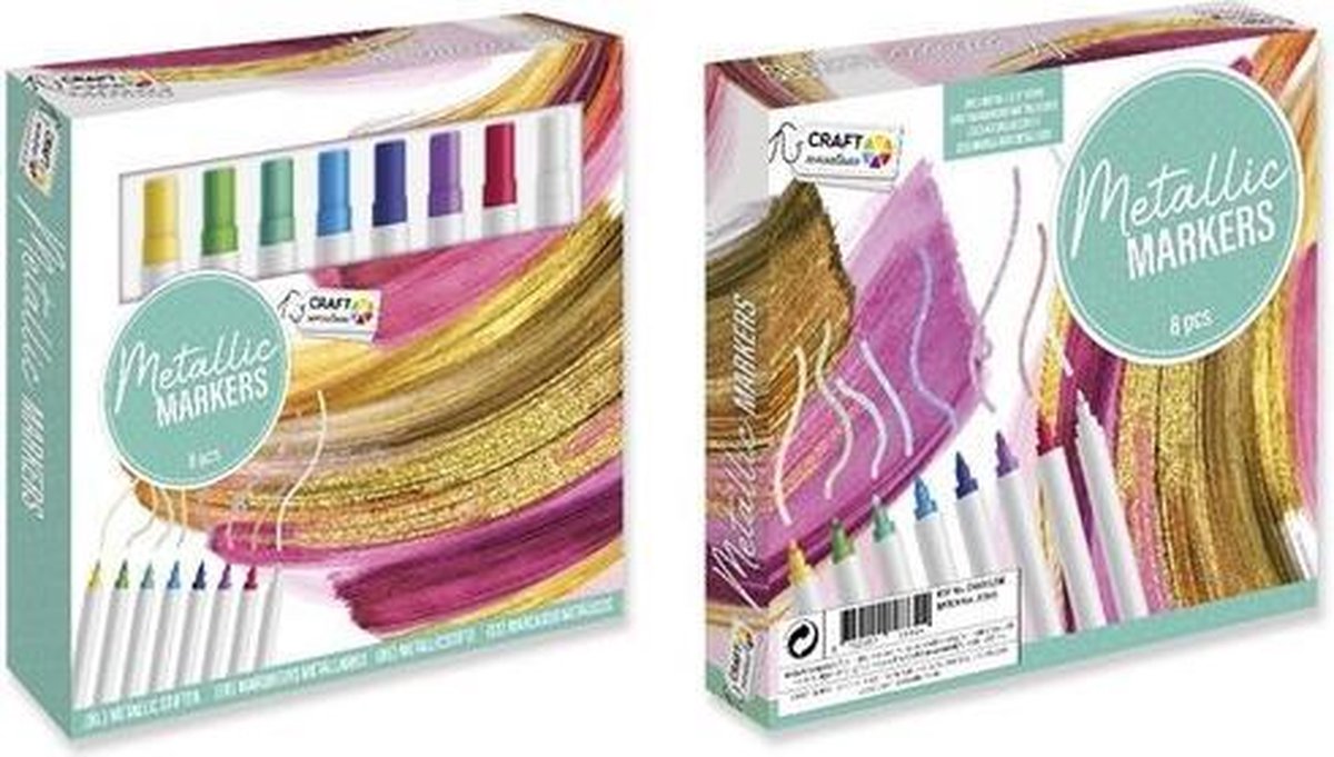 Craft Sensations Metallic Markers. Deze markers hebben een container welke gevuld is met rijk gepigmenteerde inkt. In de container zit een kogeltje. Dus goed schudden voor gebruik. De nib druk je voorzichtig in en vervolgens komt de inkt uit de marker. 8 Markers in 8 verschillende kleuren.