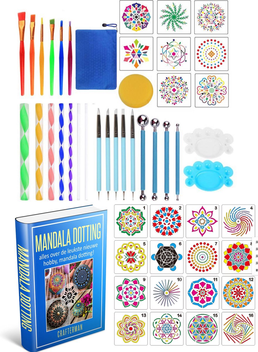 Mandala dotting, de nieuwste schilder rage in Nederland en België! Met deze mandala dotting set maak je de mooiste Mandala creaties. Inhoud set: • 24x - 13x13cm Mandala vormen • 1x Grote spons • 1x Waterdichte opbergtas • 5x Kwasten • 2x verfpaletten • 4x tweekoppige kogelpennen • 8x grote stippennen • 5x dubbele druppelpennen Waarom Mandala dotting Het maken van mandalas is niet alleen leuk om te doen, het brengt ook nog eens vele voordelen met zich mee! Hieronder een overzicht waarom jij zou moeten beginnen met Mandala dotting: 1. Het ontspant je lichaam en geest. 2. Ontwikkelt een gevoel van geluk, innerlijke rust en algemene welzijn. 3. Vermindert angst, piekeren, stress, zorgen maken en depressies. 4. Activeert creativiteit. 5. Verbetert focus 6. Verhoogt het gevoel van eigenwaarde, zelfacceptatie en zelfvertrouwen. 7. Verbetert je slaap. 8. Bevordert een gevoel van verbondenheid met anderen en jezelf. 9. Het is leuk om te doen. Waarom specifiek deze set Deze