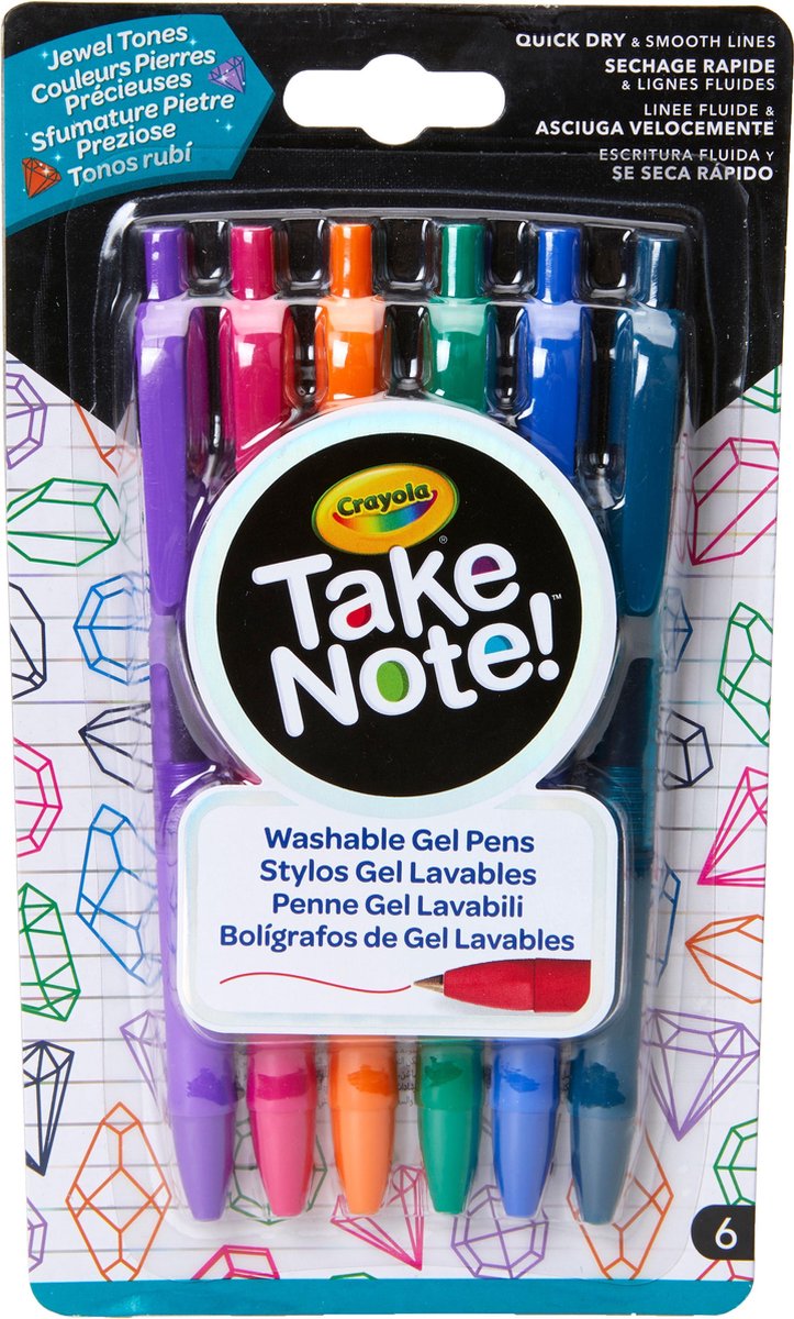 Creëer kleurrijke tekeningen, notities en aantekeningen met Take Note! afwasbare gelpennen van Crayola! Ook voor handlettering en bullet journaling zijn deze gelpennen ideaal. Elke gelkleur heeft een 0.7mm punt, geeft een mooie egale kleurafgifte en is niet streperig. De inkt van de gelpennen droogt namelijk snel. Daarnaast is de inkt ook prima afwasbaar van huid en kleding. Het antislip materiaal op de precieze plaats van iedere vinger zorgt voor een zachte en ergonomische fijne grip van de gelpen. De pennen hebben geen dop, maar een handig kliksysteem. Deze verpakking bevat 6 gelpennen in de kleuren: lila, rood, oranje, groen, blauw en donkerblauw. Gebruik de pennen op school of in je vrije tijd om te tekenen, versieren of schrijven. Geschikt voor kinderen vanaf 6 jaar. - 6 heldere kleuren gelpennen. - De inkt is afwasbaar van huid en kleding. - Comfortabele en plezierige ligging in de schrijfhand.