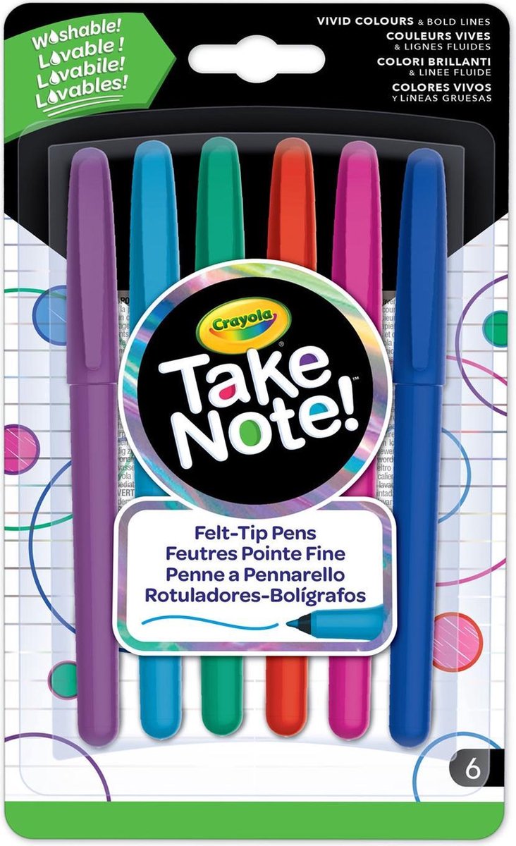 Creëer kleurrijke tekeningen, notities en aantekeningen met de Take Note! viltstift pennen van Crayola! Deze viltstiften geven heldere en felle kleuren en zijn daarnaast afwasbaar van huid en kleding. Elke vilstift pen geeft een mooie egale kleurafgifte en is niet streperig. Dat maakt de viltstift pennen perfect om kleurrijke krabbels te maken en om creatief aan de slag te gaan met bullet journaling. De inkt van de viltstiften droogt snel waardoor de stiften niet vlekken. - 6 heldere en felle kleuren viltstift pennen. - Inkt is afwasbaar van huid en kleding. - Ideaal voor bullet journaling