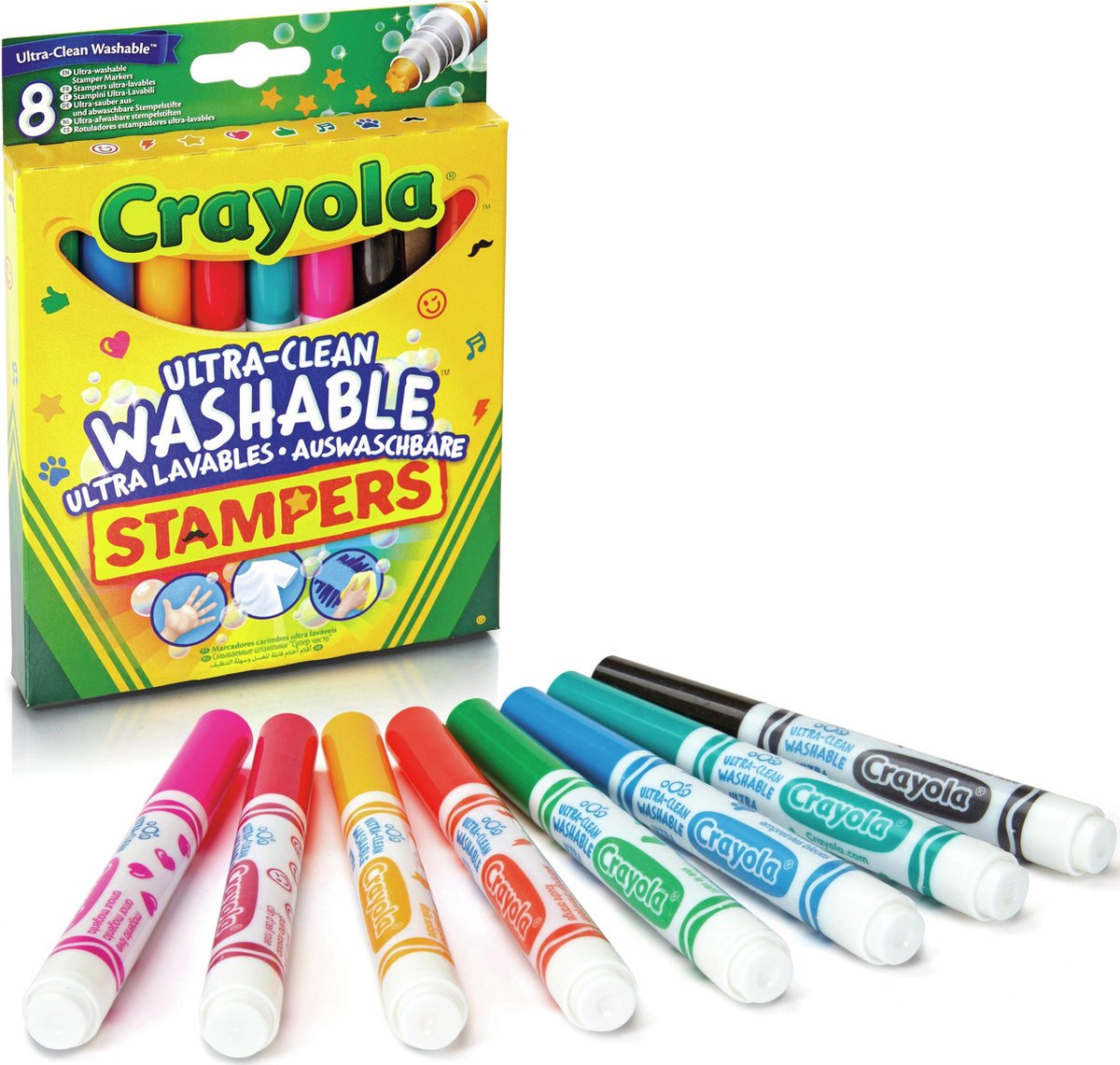 Superleuke Crayola stempelstiften om al jouw tekeningen en knutselwerkjes te versieren. Deze set bevat 8 verschillende kleuren met elk een ander figuur zoals een sterretje, snor en hartje. De Inkt van de stempelstiften is super makkelijk afwasbaar van huid, kleding en zelfs muren. Geschikt voor kinderen vanaf 3 jaar. - 8 verschillende kleuren en figuren. - Inclusief geventileerde veiligheidsdop. - Inkt makkelijk afwasbaar van huid, kleding en zelfs muren.