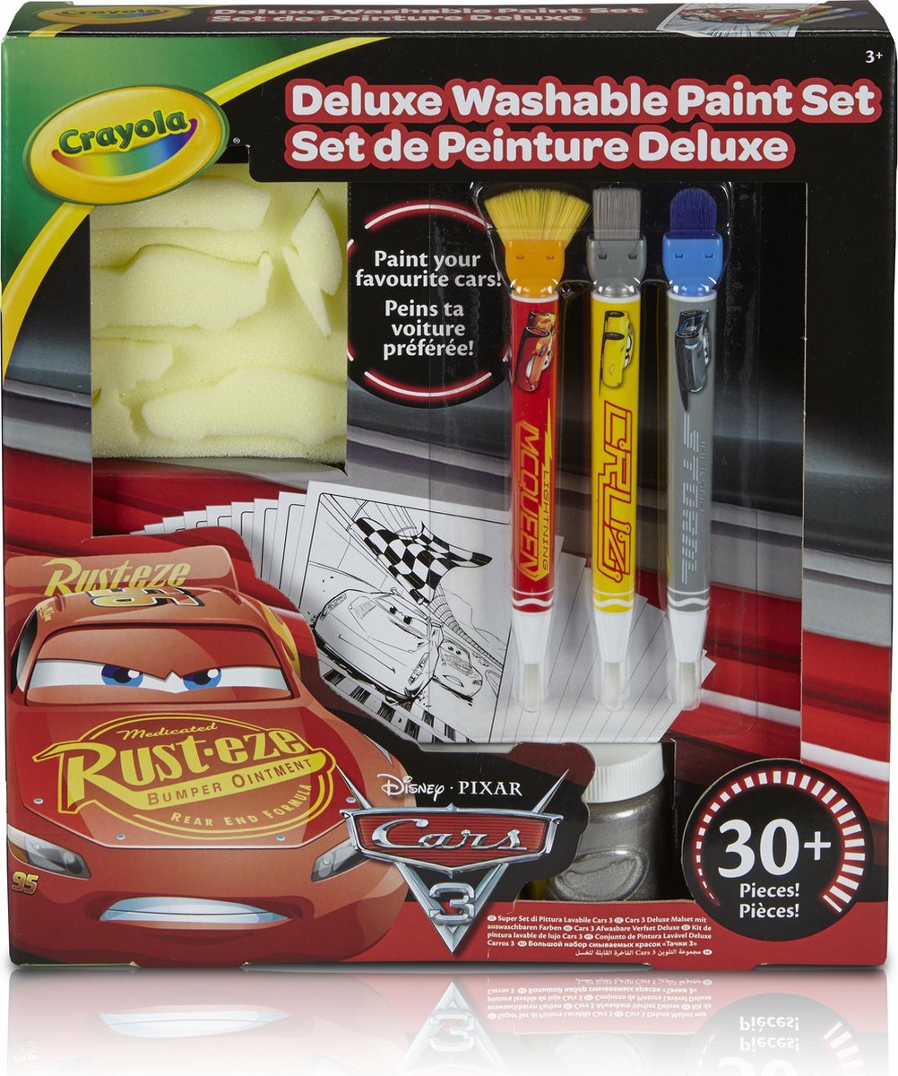 Maak de mooiste verftekeningen met de Disney Cars 3 Verfset! Kies het penseel met jouw favoriete Cars 3 personage (Bliksem McQueen, Jackson Storm of Cruz Ramirez) en ga aan de slag. Deze set bevat 10 kleurplaten maar ook blanco papier om zelf spannende raceavonturen te schilderen. Maak jouw verftekening af met de bijgeleverde sponsvormen. - Bevat 3 Cars-penselen, 5 sponsvormen, 10 kleurplaten, 3 flesjes afwasbare verf (59 ml) en 10 vellen blanco papier. - Crayola afwasbare plakkaatverf is afwasbaar van huid en kleding. - Uitgebreide verfset voor urenlang knutselplezier!