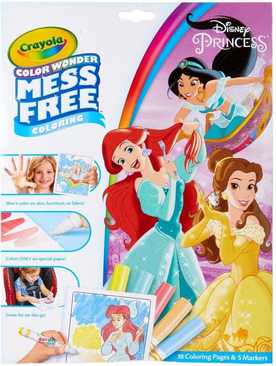 Houd het Colour Wonder leuk met 18 kleurloze pagina's zonder knoeien van Disney Princess! Color Wonder-markers werken alleen op speciaal papier. Kleurt niet op de huid, meubels of tapijten. Bevat ook 5 Color Wonder Markers