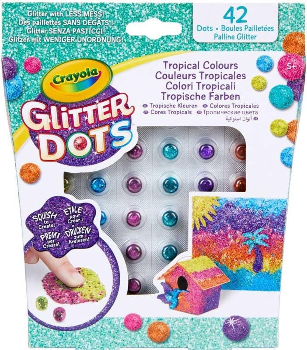 Met de Glitter Dots brengt Crayola een innovatieve manier van knutselen met glitter. Een mix van lijm, glitter en een beetje magie! Deze vrolijk gekleurde balletjes houden de glitters goed vast. Kinderen kunnen tijdens het knutselen dus lekker aan de slag met glitters zonder veel geknoei. De Glitter Dots hebben een bijzondere en zachte textuur, waardoor je ze eenvoudig kan verspreiden met je vingers of mengen met elkaar voor unieke glitterkleuren. Voor meer decoratieplezier kun je losse Glitter Dots ook direct op karton, hout of papier plaatsen. De lijm van de Glitter Dots hardt uit, waardoor de glitters op het oppervlakte blijven plakken. Gebruik je verbeelding en creëer unieke glitterdecoraties!
