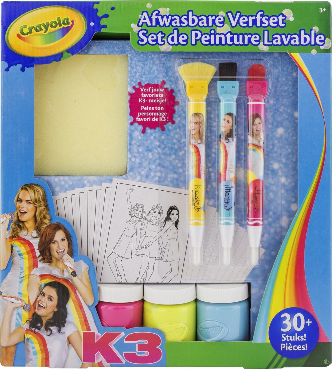 Deze uitgebreide Crayola K3 Deluxe Verfset bevat alles wat je nodig hebt voor een creatief avontuur met K3! Verf jouw favoriete K3-meisje en maak je creatie af met de vrolijke verfsponsjes. De bijgevoegde penselen zijn aangepast aan de haarkleur van de 3 zangeressen en hebben daarnaast verschillende vormen. Met welke verftekening ga jij de show stelen? - Bevat 3 K3-penselen, 5 sponsvormen, 10 kleurplaten, 3 flesjes afwasbare neon verf (59 ml) en 10 vellen blanco papier. - Crayola afwasbare plakkaatverf is afwasbaar van huid en kleding. - Uitgebreide verfset voor urenlang knutselplezier!