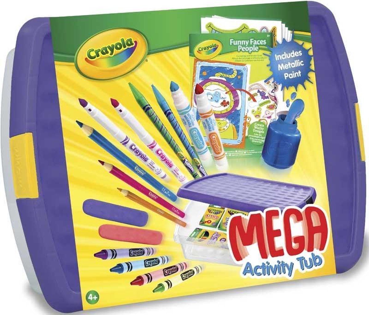 Het Crayola Mega Activiteitenpakket is een kuip vol creatief plezier, met alle knutsel- en kunstgereedschappen die je nodig hebt om te kleuren en te creëren in heldere Crayola-kleuren! Als u klaar bent, kunt u al uw gereedschap in de handige plastic bak stoppen om ze gemakkelijk op te bergen. Dit pakket bevat: 12 Supertips Een Funny Faces kleurboek met 24 pagina's en 2 stickervellen 10 draaibare kleurpotloden 8 stuks klassieke boetseerklei 8 afwasbare stiften met dikke punt 8 waskrijtjes 12 kleurpotloden 3 potten metallic verf 1 Opbergdoos Geschikt voor kinderen ouder dan 4 jaar.