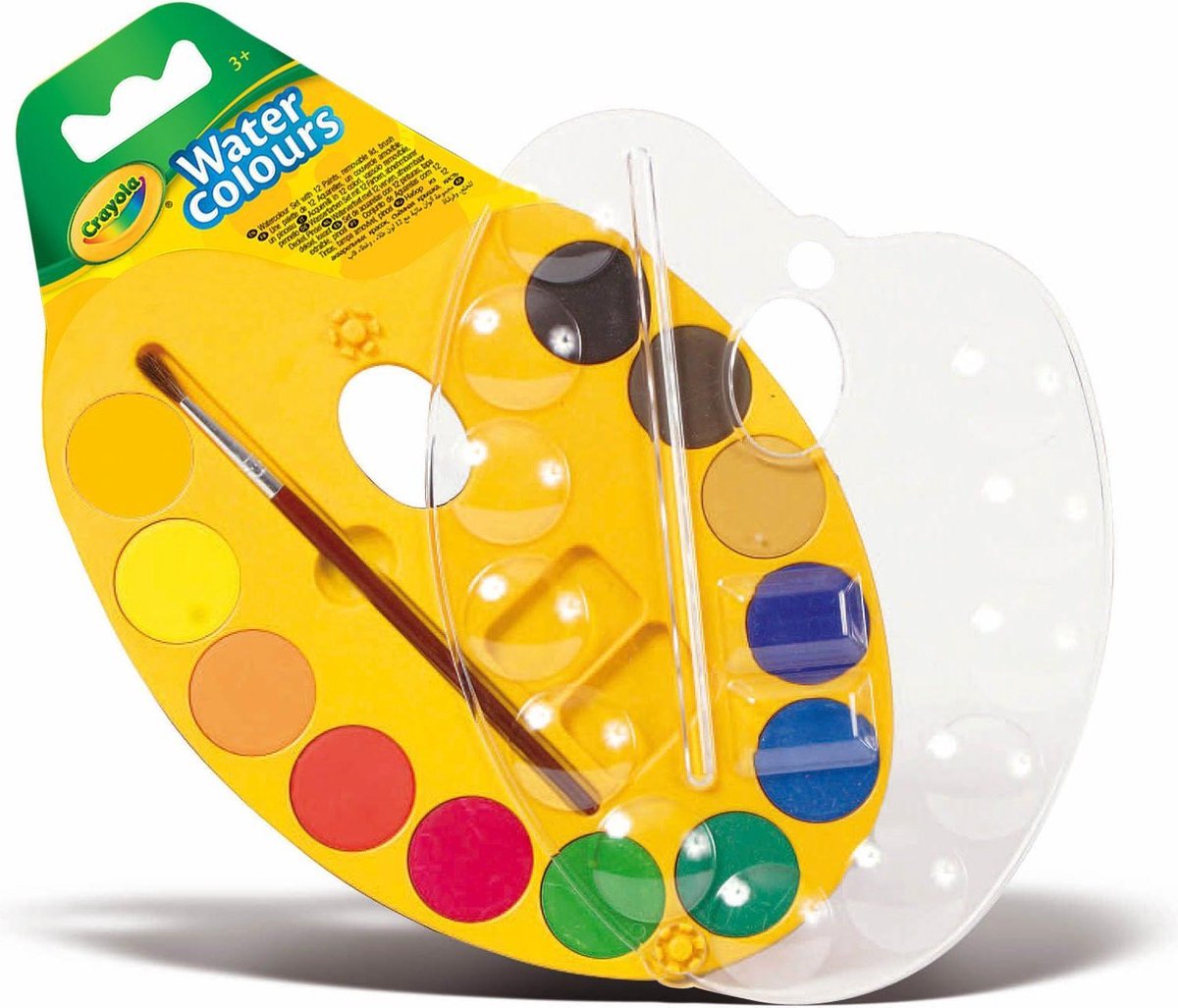 Het ultieme schilderspalet voor kleine kunstenaars! 12 heldere kleuren waterverf, een penseel en een deksel dat dient als echt mengpalet. Geschikt voor kinderen vanaf 3 jaar oud. - Verf beschikbaar in 12 heldere kleuren. - Deksel kan als mengpalet dienen. - Crayola waterverf is afwasbaar van huid en kleding.