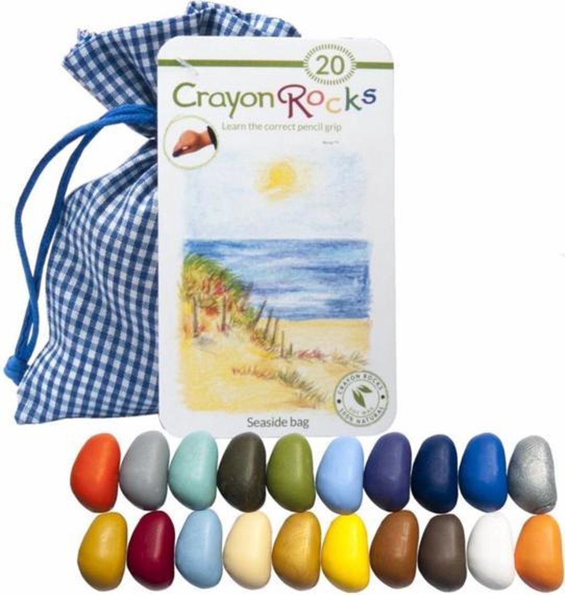 Crayon Rocks in een blauw-wit geruiten zakje met zee, zon, lucht en strandkleuren. Crayon Rocks is ontwikkeld door een Amerikaanse lerares Barbara Lee, die werkte op een school voor kinderen met een motorische of emotionele beperking. Ze werd geïnspireerd door therapeut Jan Olsen en haar ‘Handwriting without tears’ programma. Van Jan Olsen leerde zij hoe belangrijk het is voor kinderen om een sterke grip te ontwikkelen in de vroege fases van hun leven. Dit hebben ze later nodig bij het leren schrijven. Barbara ging op zoek naar schrijfgerei dat deze eigenschappen bevat, maar toen ze er geen kon vinden besloot ze het zelf te ontwikkelen. Het ontwerp van Crayon Rocks Het eerste schrijfgereedschap dat een kind gebruikt is vaak een krijtje. Daarom besloot Barbara Lee dat een krijtje het voorwerp moest zijn om de juiste grip te leren. Door de speciale vorm moedigt het krijtje kinderen aan om hun duim en eerste twee vingers te gebruiken bij het vasthouden. Deze speciale vorm maakt het