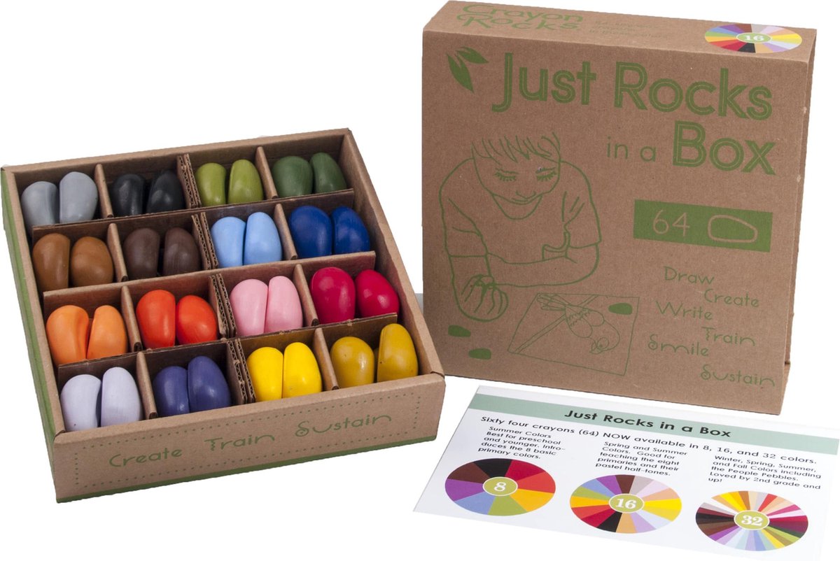 100% natuurlijke wasco's, gemaakt uit sojabonen. De kleuren zijn volledig met natuurlijke pigmenten bekomen. de krijtjes hebben een speciale handgreep, die het voor kleuters nog makkelijker maakt om te kleuren, de zogenaamde 'pengreep'. De zachte kleuren zorgen ervoor dat je mooi in elkaar overlopende kleurvlakken kunt creëren en in tegenstelling tot de normale wasco's, zijn de Crayon Rocks niet plakkerig. Zitten in een stevige kartonbox: 16 kleuren. Per kleur 4 waskrijtjes. Getest op verschillende ondergronden door onze would-be picasso's.
