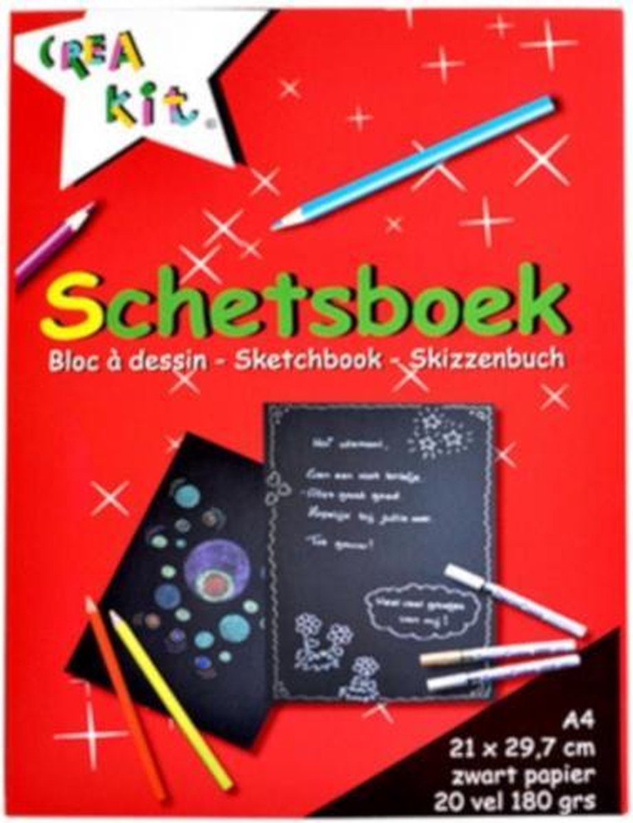 Crea-kit schetsboek Laat je creativiteit de vrije loop met dit schetsboek. Maak er een mooie tekening op en oefen jouw tekenvaardigheden. Het stevige papier heeft een matte textuur, waardoor je er fijn op kunt tekenen. Specificaties: Geslacht: junior Kleur: zwart Materiaal: papier Papierformaat: A4 Afmetingen: 21 x 29,7 cm (B x L) Dikte papier: 180 grs Leeftijd: vanaf 4 jaar