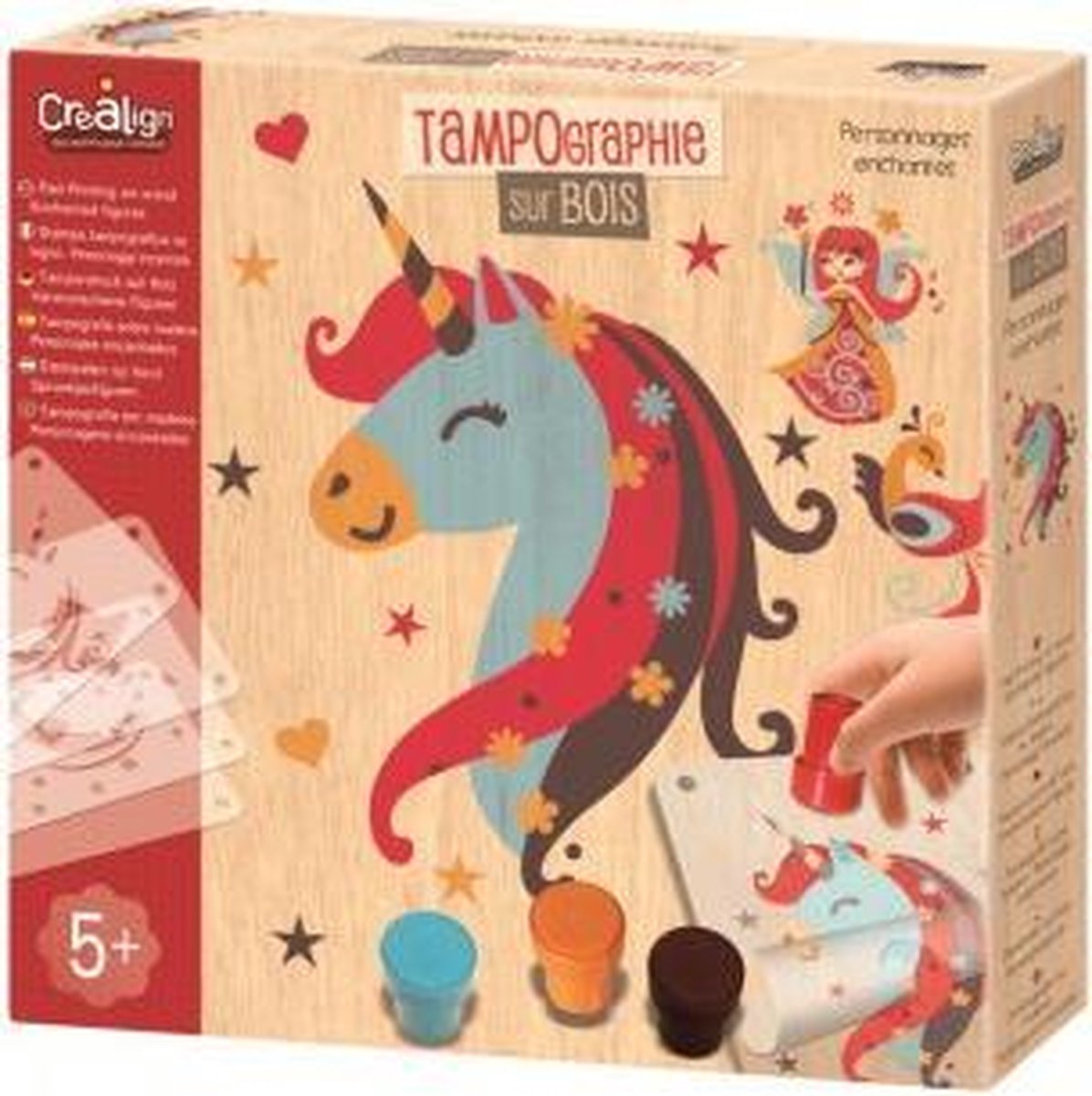 Teken de sprookjesfiguren op hout met behulp van de vierkleurensjablonen. Daarna kun je ze ophangen met behulp van de bijgeleverde koord, 3 houten ondergronden, 12 sjablonen, 4 kleuren inkt, koord