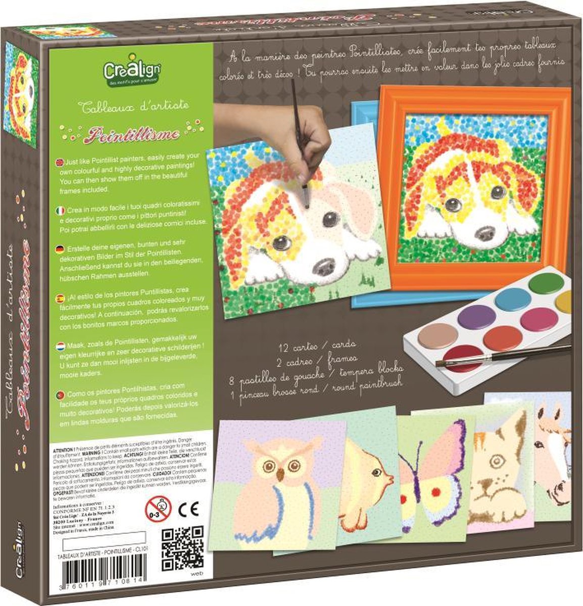 Je kunt de stippen kunstwerken na voltooiing inlijsten in de bijgeleverde kaders. Inhoud: 12 kaarten 2 kaders 8 kleuren verf 1 rond penseel