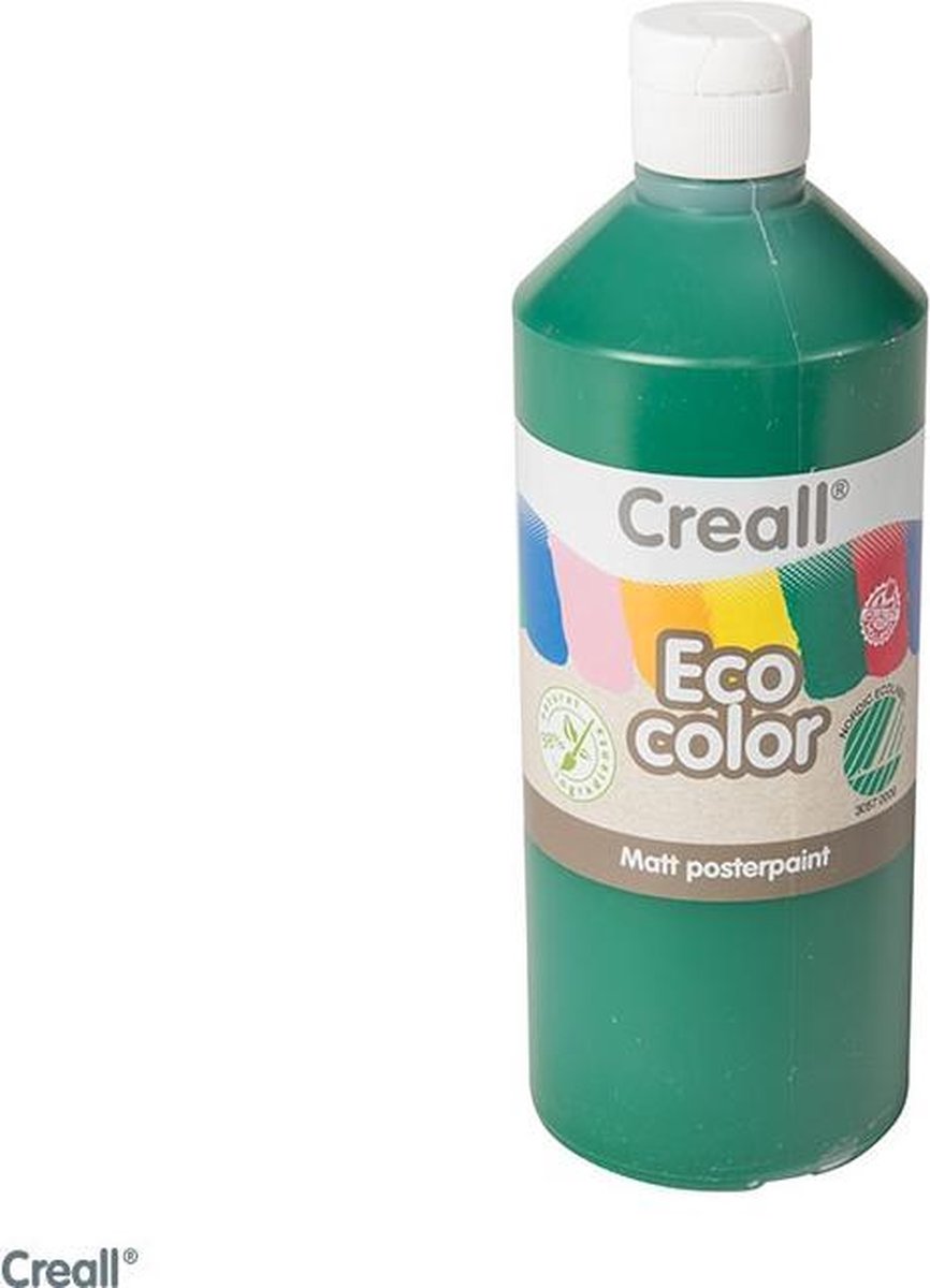 milieuvriendelijke plakkaatverf op waterbasis 98% grondstoffen van natuurlijke oorsprong gebruiksklaar of mengbaar verkrijgbaar in 24 kleuren in praktische knijpbare fles gemaakt van hernieuwbare grondstoffen kleuren onderling mengbaar na droging mat werkstuk watervast maken met Creall- varnish