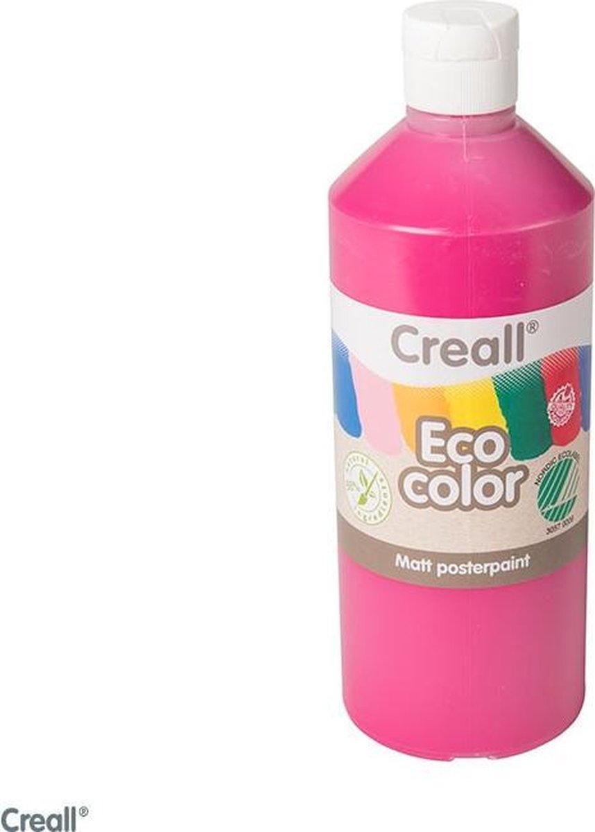 milieuvriendelijke plakkaatverf op waterbasis 98% grondstoffen van natuurlijke oorsprong gebruiksklaar of mengbaar verkrijgbaar in 24 kleuren in praktische knijpbare fles gemaakt van hernieuwbare grondstoffen kleuren onderling mengbaar na droging mat werkstuk watervast maken met Creall- varnish