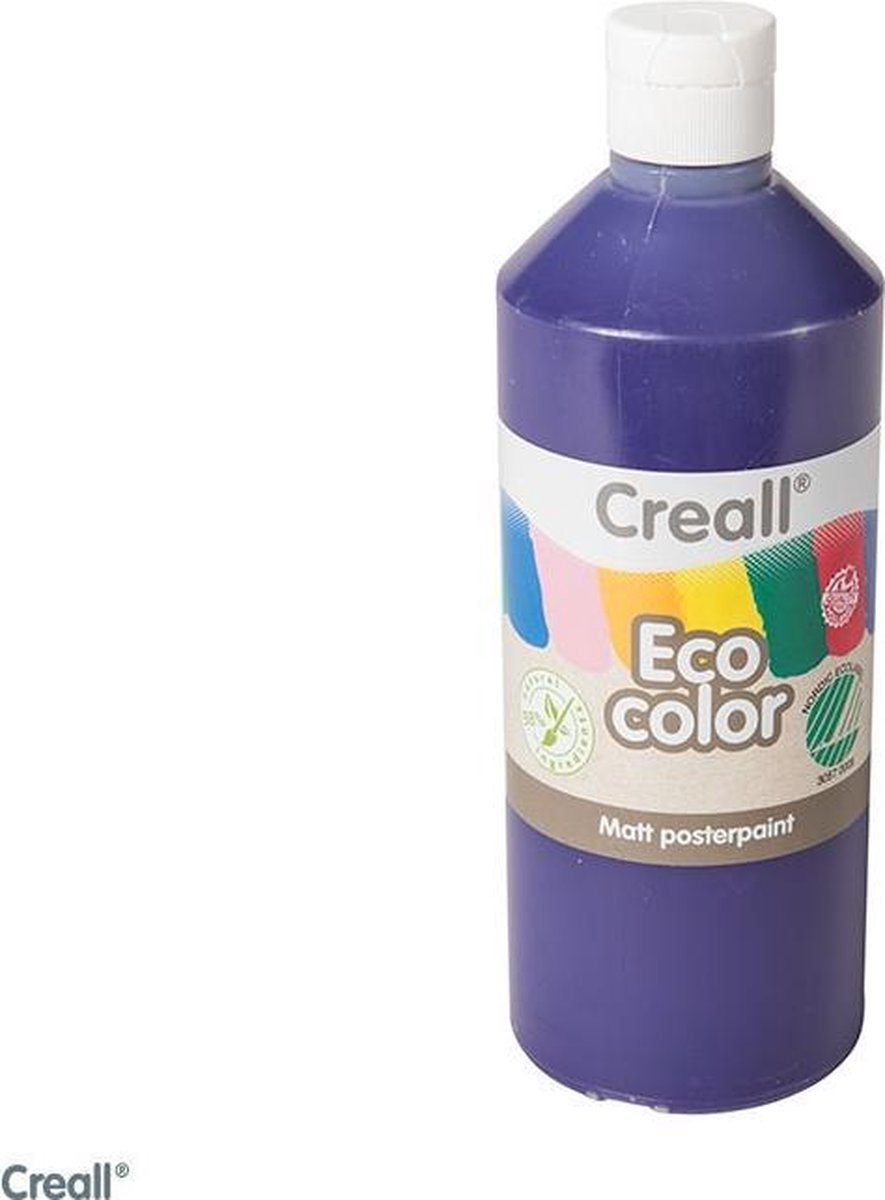 milieuvriendelijke plakkaatverf op waterbasis 98% grondstoffen van natuurlijke oorsprong gebruiksklaar of mengbaar verkrijgbaar in 24 kleuren in praktische knijpbare fles gemaakt van hernieuwbare grondstoffen kleuren onderling mengbaar na droging mat werkstuk watervast maken met Creall- varnish