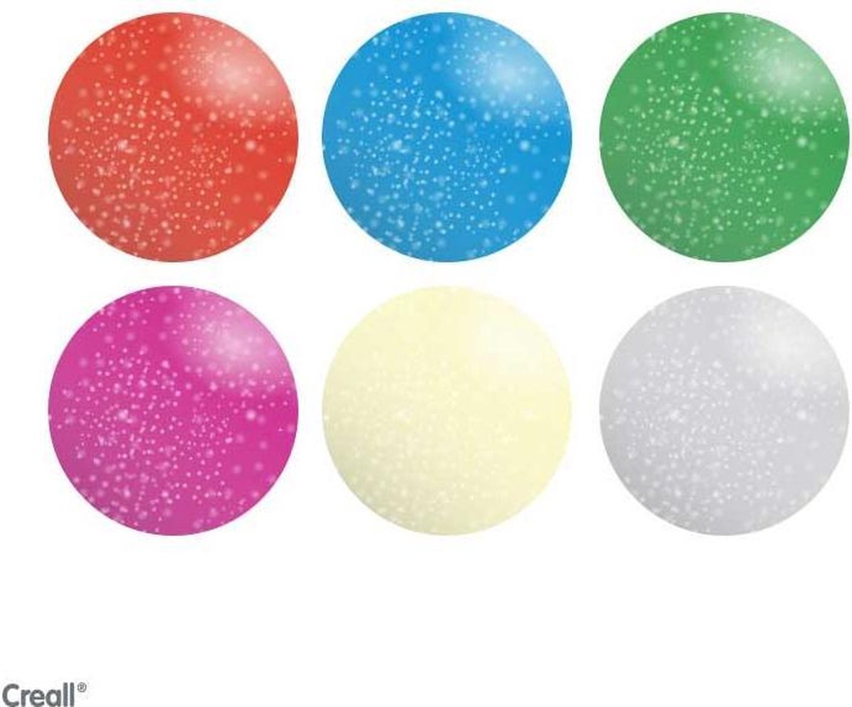 gekleurde verf met glitters goede hechting op papier, karton en foam na droging watervast verkrijgbaar in 6 kleuren (groen, blauw, geel, paars, rood, wit)